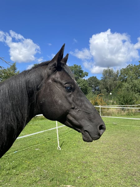 Der 9-jährige Rapphengst ist halfterführig sowie schmiede- und verladefromm. Der aufmerksame Hengst wurde aus seiner ursprünglichen Haltung in einer tierschutzrechtlichen Maßnahme fortgenommen. Der Hengst hat auf dem rechten Auge eine alte Hornhautverletzung und noch nicht in bestem Futterzustand, erholt sich aber zusehends. Er ist freundlich und dem menschen zugewandt. Er ist Offenstallhaltung gewöhnt, muss jedoch sicher eingezäunt werden, da er wenig Respekt vor Stromzäunen hat, insbesondere wenn diese nur eine geringe Spannung (oder gar keine) aufweisen. In Obhut wurde er gegen Tetanus geimpft und entwurmt. Eine Zahnbehandlung ist angeraten. Eine Kastration ist vorab möglich.