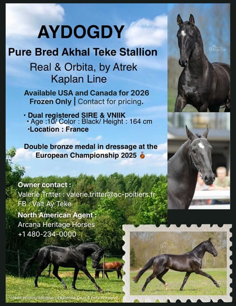 An esteemed addition to the 2026 stallion line-up, we are honored to partner with Valt Ay Teke to represent Akhal-Teke Aydogdy (Real x Orbita, Kaplan sire line, Ovgan dam line) for North America! Frozen only, available to the USA and Canada. Aydogdy is a magnificent 16hh black stallion bred by Jean Christophe Bourguignon in France and now excelling in dressage with the wonderful Valerie Tritter. He has a balanced build, beautiful movement, great working mind, and a lot of presence. Aydogdy debuted his career last fall, winning double bronze dressage medals at the 2025 European Championships where we had the pleasure of meeting him in person. This year, Aydogdy became the first Akhal-Teke stallion accepted to the renowned Haras de Gelos, a national stud of France established in 1808 by Napoleon Bonaparte! There he will continue his development with the added guidance of Catherine de Lartigue. He was presented at Gelos’ 2026 opening day in the “courtyard of the greats” alongside prestigious Arabians, Thoroughbreds, and Anglo-Arabians–becoming a stallion to watch. Aydogdy inherited floaty movements, strong back, and great character from his sensational sire Real, who was a Reserve Champion of Russia from the late racing Veles Stud farm. His dam, Orbita, is an exquisite and typey mare from Stavropol with a deeply sportive lineage. The union of the two produced a lovely athlete in Aydogdy. He is a grandson of Regina, an elite producer from Gaidamak 12 and beloved mare Raketa; Regina was also dam to elite stallion Pairregin from which we imported breedings from in 2024. Aydogdy is grandson to quality producer Ashug. He is great grandson of great racer stallion Orlan from jumping/racing champion 943 Arslan and of champion producer mare Oprava (both of the famous Oktava-Ovgan family). He is also great grandson of elite stallion Khutor, an exceptional son of outstanding parents Halif (who was one of Fakirpelvan’s best sons, a successful racehorse, and an elite producer) and Takappara 2 (best daughter from Olympic Gold dressage stallion Absent). Within 4-gen, Aydogdy also carries superdam Aisona, foundation sires Kaplan and Gundogar, and Dagestan stallion Ahmed. 💌 For information and pricing on breedings to this promising young stallion in North America, contact us! He may be the start of a new legacy in your program. Photos from Valt Ay Teke, Ekaterina Druz, France Sire, Noelle Schon, and Fefa Koroleva.