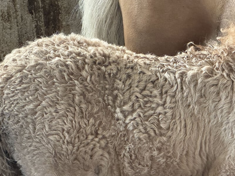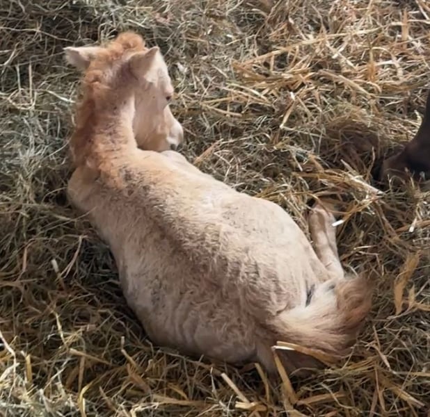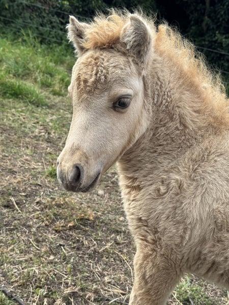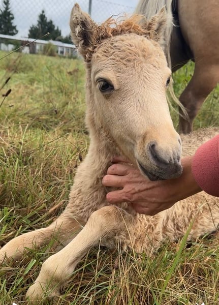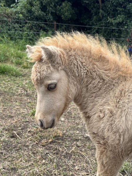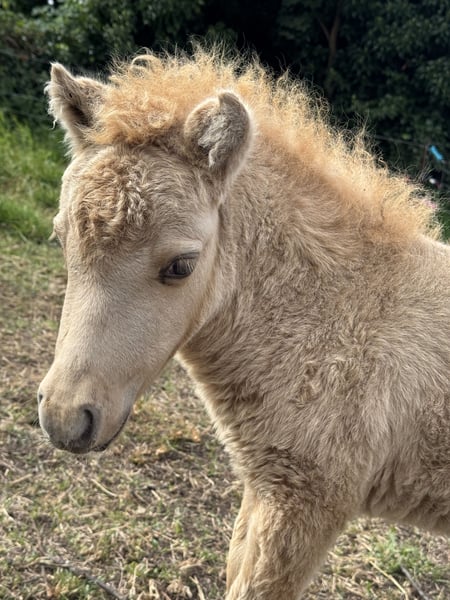 AQM Fames Surprise Blessing, born: July 2, 2025, color: Dunalino Sire: World Champion Los Arboles Idols Claim To Fame Dam: Premiers Special Blessing Final height approx. 32-33“ Surprise is undoubtedly the sweetest temptation since miniature horses came into existence. He is correct, has a fantastic character, and… curls! Where they come from, no idea, but they make him something very special. He is the fourth foal from this pairing, and all of them have turned out exceptionally well. His sire Fame is a World Champion, and his dam has also been successful at many shows in Europe. His siblings are successful driving, therapy, and breeding horses, and little Surprise has all paths open to him. A mini for everything that is fun. For more information, photos, and videos, feel free to follow us on Instagram: aquamarineminiatures