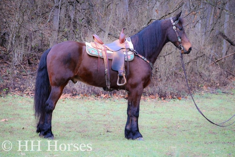 ONLINE AUCTION Place your bids at www.PlatinumEquineAuction.com Starting Bid $3500 Auction ends January 26th, 2025 Need a new saddle? Check out White Rock Saddles on our website or Facebook! Meet “Mr. KATMANDU”, a real gentle, real broke, fun, fancy, and quiet BAY FRIESIAN MORGAN CROSSBRED GELDING. He is broke to ride and drive and will also hook up and work to farm machinery. He is 15.3 hands tall and 9 years old. He has been through our cross country driving course and will cross the rushing water with a buggy or wagon fine. He will also trail ride anywhere you want to go, he is sure footed, honest, brave, and will ride out alone or in a group. He is fun to ride and stops hard, backs up, turns easily, and moves off of leg cues. He is just a real fun Friesian gelding that isn’t too fast and isn’t too slow. He is traffic safe, not spooky, and has no tricks and no surprises. He will lope off with no buck and no hump. He has a nice jog, a good walk, and a steady canter. He likes attention, has excellent ground manners, and he aims to please. He has been driven to town and in the pastures to check cattle. He’s versatile, pretty, smart, and sane. Contact HH Horses Erin 304-238-4155 for more info or to make a Buy It Now Offer. Located in Flemingsburg, KY.
