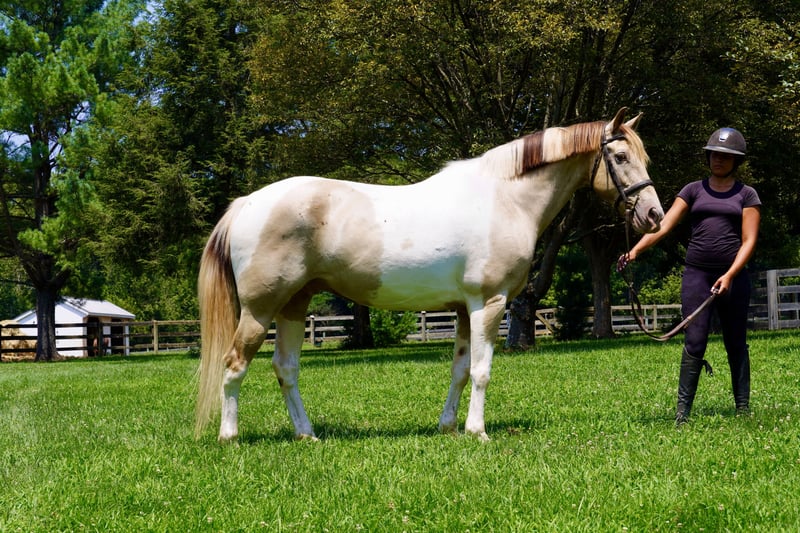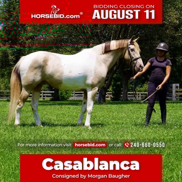 ⚜ The HERITAGE Classic ⚜ Happening now thru MONDAY | AUGUST 11th - Available EXCLUSIVELY on HorseBid's website! For more details and to register visit: www.Horsebid.com CONSIGNOR CONTACT: Morgan Baugher 240-660-0550 LOCATION: Tuscarora, MD BREED: Paint Draft Cross REGISTERED: No COLOR: Palomino Paint HEIGHT: 15.3 AGE: 11 GENDER: Gelding Casablanca is an 11 year old Palomino Paint Draft Cross gelding standing 15.3 hands high. He is incredibly beautiful with his rare color. He is barefoot and an easy keeper with a honest wonderful personality. He crosses bridges, creeks, goes over logs and goes English or Western. He’s the perfect size for kids and adults. Casablanca has been used in lessons with teenagers and has gone off the farm for adventures to state parks. He is a fabulous trail horse that is always ready to go on the next adventure. He has been the perfect partner for his teenage rider over the years, but she went to college. We are looking for him to find his next forever family. On farm, Casablanca is agreeable and ready to trail ride, jump, go cross country or be groomed and loved on. He is super smooth to ride with great gaits. He carries himself and is a team player that would excel on long rides if you wanted to take him out for an entire weekend. He wants to be with you and is forward thinking on the next fun adventure you are going to take him on. He has the best work ethic. He has more of a dog’s personality than a horse. He can go bitless or rides in a snaffle. Offers a very soft mouth. He is currently being ridden by a 16 and 17 year old. They both adore him and he’s their favorite horse on the property. He will stand for hours being groomed and loved on. He ties incredibly well. Great in a field, no supplements, no maintenance, no known issues of any kind. Lovely loving horse. Barefoot! Easy for the vet and farrier and comes with an UTD Coggins. Located in Frederick County MD Pre purchase exams are welcome at buyers expense and we can help arrange shipping to anywhere in the country.