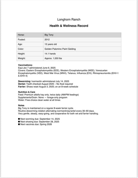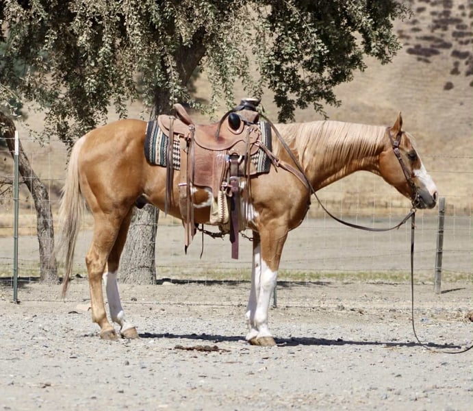 ONLINE AUCTION Place your bids at www.PlatinumEquineAuction.com Starting Bid $3500 Auction ends September 28th, 2025 Need a new saddle? Check out White Rock Saddles on our website or Facebook Meet Big Tony — a 13-year-old, 14.1 hand golden palomino paint gelding who has officially earned his title as Trail Horse Deluxe. He’s the kind that makes you relax the moment you swing a leg over, because you know he’s got everything handled. Tony is as broke and easy as they come. One-hand neck rein, soft lope, good stop, patient, forgiving — he’s the whole package. He’s simple, honest, and always the same no matter the day or the place. If you can steer a bicycle, you can ride Big Tony. His passport of experiences reads like an adventure catalog: parades, town traffic, rivers, bridges, brush, logs, tarps, pool noodles, cattle work, and every obstacle someone could dream up. None of it rattles him. He’ll carry the littlest rider or the greenest adult without batting an eye, always with his big kind heart leading the way. In the arena he’s just as straight forward and easy picks up leads stops and backs nicely. On the ground, Tony is just as deluxe. He ties, clips, bathes, hauls, and stands quiet for the farrier. He’s happy in a stall or pasture and greets you at the gate like an old friend who’s always glad to see you. Big Tony isn’t trying to be a fancy show horse. He’s better than that. He’s the dependable, steady, go-anywhere, do-anything gelding that families keep forever because life is just easier with him around. If you’ve been searching for a trustworthy partner to trail ride, or simply enjoy day in and day out, this is the guy. 📞 Contact Dina at Longhorn Ranch 831-537-1915 with any questions. Located in Paicines, CA. ONLINE AUCTION Place your bids at www.PlatinumEquineAuction.com Starting Bid $3500 Auction ends September 28th, 2025 Need a new saddle? Check out White Rock Saddles on our website or Facebook