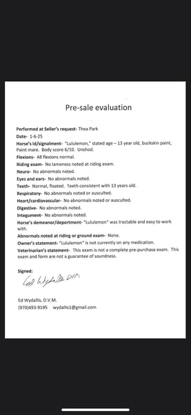 ONLINE AUCTION Place your bids at www.PlatinumEquineAuction.com Starting Bid $3500 Auction ends February 3rd, 2025 Need a new saddle? Check out White Rock Saddles on our website or Facebook! Lululemon (aka Lulu) is a 13 year old, 15hh buckskin paint mare that is one of the smartest mares out there! You could literally teach this mare algebra if you wanted to. She is eager to please, LOVES games (or anything new to learn) and is an absolute gem to be around on the ground and in saddle! (Not to mention built well and absolutely stunning!) Lulu was trained by a level 4 parelli student and has EXTENSIVE Talent and skills in the parelli world! , you can point her around an obstacle course with just your finger or lunge outside of the arena with just your voice and body language, on top of hundreds of little games she knows (and a bow!) Lulu is also an extreme athlete and excels in the cross country, hunter jumper and eventing world! This mare has never refused a jump and has incredible endurance, athleticism, scope and tuck! Lulu is well versed on trails too! Whether you’re going on a long mountain trip or a quick ride through town she is up for the adventure! She is very used to crazy and chaotic scenes and there is nothing on the trail that could spook her! We have also done some western pleasure and western dressage training with Lulu which she has taken a liking too and picked up on quickly! She is an extremely fancy mover with a great headset and very supple bodied. No matter what you want to do this mare is up for the job and extremely capable. Watch her video and come see how incredible Lulu truly is! Call Dynamite Horses Thea 970-632-3644 with any questions. Located in Fort Collins, CO. ONLINE AUCTION Place your bids at www.PlatinumEquineAuction.com Starting Bid $3500 Auction ends February 3rd, 2025 Need a new saddle? Check out White Rock Saddles on our website or Facebook!