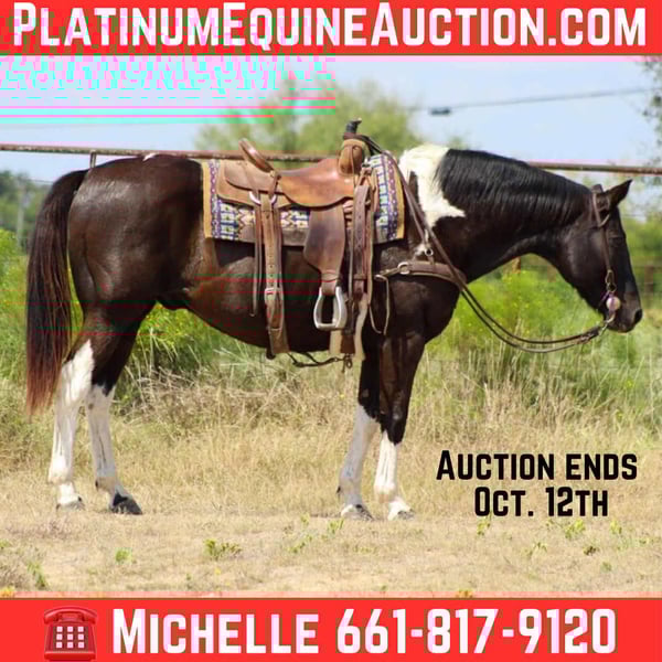 ONLINE AUCTION Place your bids at www.PlatinumEquineAuction.com Starting Bid $3500 Auction ends October 12th, 2025 Need a new saddle? Check out White Rock Saddles on our website or Facebook Meet Brisket — The Horse With a Heart as Big as His Name! Brisket is a striking black and white paint gelding standing 15.1 hands tall and 16 years young. With a personality as bold as his color, Brisket has been turning heads and stealing hearts for years! Not only is he a seasoned trail companion, but Brisket also knows how to put on a show — he shakes his head yes and no on command, and even bows! He’s the kind of horse that makes you proud to ride in front of your friends and family. Brisket is the ultimate family horse. Whether it’s grandma, grandpa, the kids, or mom and dad — he’s safe and reliable for all ages and levels. He’s been ridden countless miles on trails, worked on the ranch, and confidently participated in parades and rodeo grand entries. He’s incredibly broke, user-friendly, and as trustworthy as they come. Brisket comes from a loving long-term home, only being offered now due to unfortunate circumstances — his older owner lost his lease and could no longer keep him. We’re helping find Brisket the forever home he deserves. If you’re looking for a solid, flashy, all-around gelding with a heart of gold and a fun-loving personality, Brisket is your guy. We are open to anyone interested in him to schedule a time to come see him or if you can’t make it schedule a FaceTime showing to see him. If you need help with transport don’t hesitate to ask we have a list of reputable haulers that can get him safely to your doorstep WORLD WIDE including, Alaska , Mexico, Hawaii, Canada and anywhere in between. Located in Stephenville, TX. Contact Michelle with M $ Performance Horses 661-817-9120 with any questions. ONLINE AUCTION Place your bids at www.PlatinumEquineAuction.com Starting Bid $3500 Auction ends October 12th, 2025 Need a new saddle? Check out White Rock Saddles on our website or Facebook