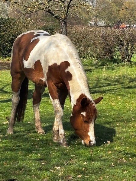Dieser kompakte, selbstbewusste junge Hengst sucht eine Person, die mit ihm arbeiten möchte. Er lebt mit seiner Mutter und zwei älteren Pferden in einer Paddock in der Region Süd-Limburg, Niederlande, ca. 25 Minuten von Aachen und Lüttich entfernt. Seit dem ersten Tag wurde er regelmäßig bewegt und kindgerecht in den grundlegenden Dingen ausgebildet, die ein Pferd in seinem Alter kennen sollte. Er ist leicht an der Hand, lernt schnell und unternimmt mit seinem Trainer nur Spaziergänge. Er scheut weder vor noch zurück. Das Training besteht derzeit hauptsächlich aus Spaziergängen ohne andere Pferde, lockeres Mitlaufen, Gewöhnung an alles, was ihm begegnet, sowie täglichen Übungen wie Rückwärtsrichten auf leichte Anweisung, Schulter- und Hinterhandwendung. Er versteht auch die Grundlagen des Klickertrainings. Derzeit ist er rangmäßig Zweiter, daher ist es wichtig, dass er in eine Gruppe kommt, in der er nicht zu schnell aufsteigt – dafür ist er noch zu jung. Ein Spielkamerad zum Toben wäre ideal. Boxenhaltung kennt er nicht, und ich würde das auch für ihn nicht wünschen. In der Gruppe zeigt er sich insgesamt ruhig und kommt neugierig auf dich zu. Täglich wird er an der Hand geführt. Suchst du einen Lebenspartner fürs Leben und hast die Erfahrung sowie die Kompetenz, mit einem jungen Pferd zu arbeiten? Dann freue ich mich auf deine Kontaktaufnahme. Mit der richtigen Ausbildung und Geduld wird er zu einem perfekten Reitpferd. Er ist selbstbewusst und nicht ängstlich, muss aber noch weiter ausgebildet werden. Er ist momentan 1,50 m groß, wird aber noch wachsen. Geboren am 03.05.2023. Mutter: April Secret Moonfire, 5-panel negativ. Vater: Rolex Sparklin Pine, 7-panel negativ. Tobiano-Farbe, Fuchs. APHA-Zuchtbuch. Niederländischer Pass. Preis wie üblich für Rasse und Alter, auf Anfrage.