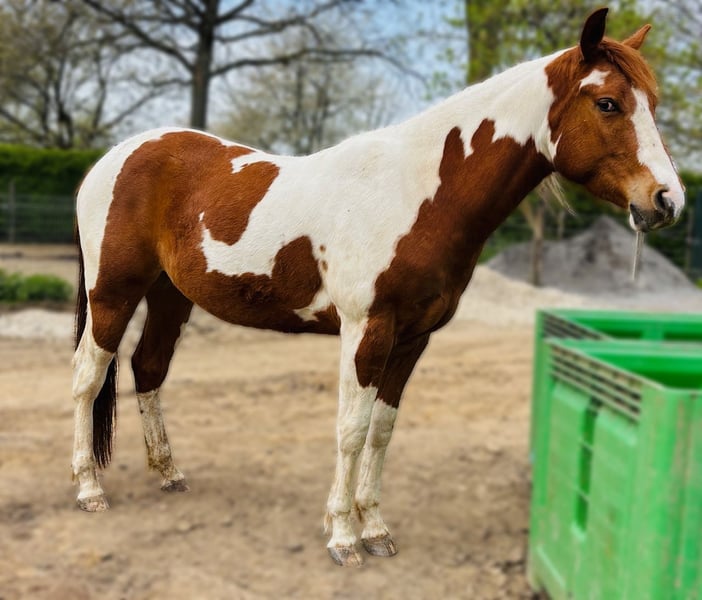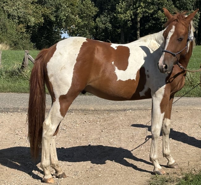 This confident, young, compact gelding is looking for someone willing to work with him. He lives with his mother and two older horses in a paddock in the South Limburg region of the Netherlands, about 25 minutes from Aachen and Liège. From day one, he has had regular movement and has been trained in a gentle, horse-friendly manner in the basic skills appropriate for his age. He is easy to handle, learns quickly, and is currently only taken on walks with his trainer. He is brave and curious, not spooking or looking around. His training mainly consists of solo walks, relaxed leading, getting accustomed to everything he encounters, and daily basics such as backing up on light aids, and moving shoulders and hindquarters. He also understands the fundamentals of clicker training. He is currently second in rank, so it’s important that he joins a group where he won’t be promoted too quickly, as he is still young. A playmate would be ideal for him. He is not used to stall confinement, nor would I want that for him. In the herd, he is generally calm and approaches you with curiosity. He is handled daily. Are you looking for a lifelong companion and have the knowledge to work with a young horse? I look forward to hearing from you. With proper training and patience, he will become a perfect riding horse. He is confident and not shy, but still needs further education. He is completely adaptable to your handling. He currently measures 1.50 m but will continue to grow. Final height is likely around 1.55 m. He has long legs and was born on May 3, 2023. His dam, April Secret Moonfire, is negative on 5-panel tests; his sire, Rolex Sparklin Pine, is negative on 7-panel tests. He is a Tobiano with a Vose coloration, APHA registered, and holds a Dutch passport. Price is in line with what is typical for this breed and age; available upon request.