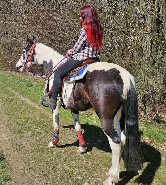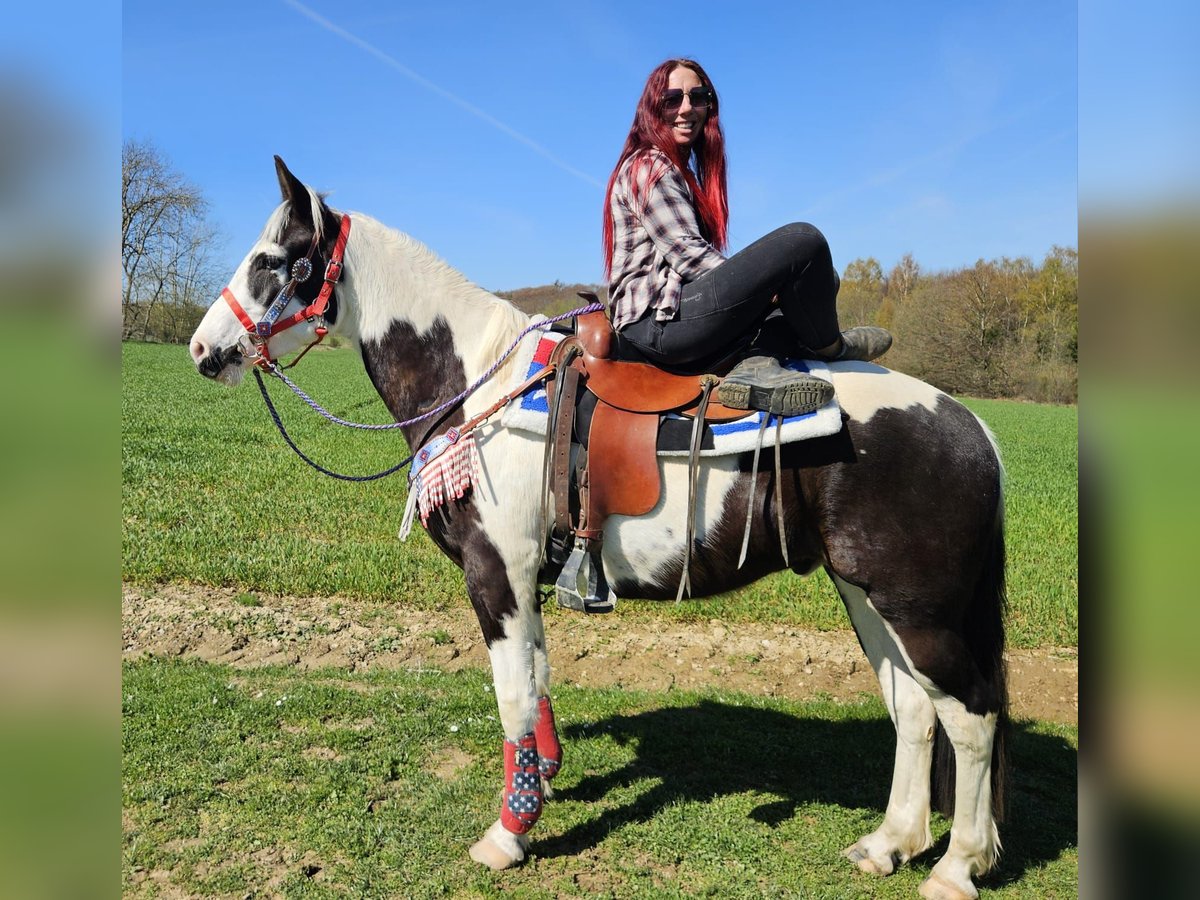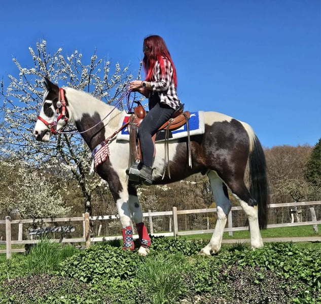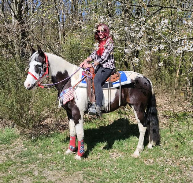 Young Paint gelding (born 2023) ROMEO in striking black and white pinto pattern seeking his new home. A real eye-catcher with an excellent build and friendly, outgoing personality. He is well-behaved, human-oriented, and pleasantly uncomplicated in handling. He has been ridden, demonstrating reliability and already showing a calm, brave, and resilient temperament. He also performs well in the terrain – whether alone or in a group. He is accustomed to open stable management and handles it without any issues. A versatile young gelding with great potential for the future – ideal for leisure riding and further training. Romeo, 3 years old, approximately 1.56 m, health certificate available, E-Pass, €7,400. Ridden Reliable & balanced Confident in the terrain, even alone Nerve-proof Used to open stable management Harmonious, strong build Versatile use A young gelding with charisma, character, and lots of potential – a true partner for the future. Care & Maintenance: – Regular deworming – Farrier cared for – Osteopathically treated Additional offers: Western saddles, bridles, and other accessories available. Service: health certificate included, approximately 1.56 m, E-Pass, €7,400. – Transport can be arranged – 3 months exchange guarantee Test rides: – €35 (each additional horse €25) – Deducted from purchase price if bought on the same day Discount for immediate pickup or transport on the same day: – Category 1: €100 – Category 2 (from €5,000): €250 Phone: 0171 – 4001968 Available daily from 8 am to 8 pm No email or WhatsApp messages All information provided without guarantee