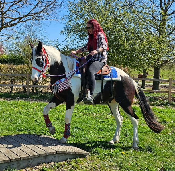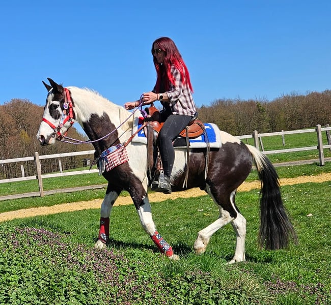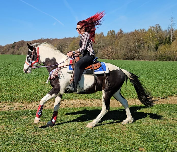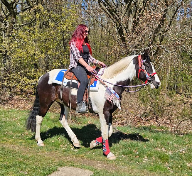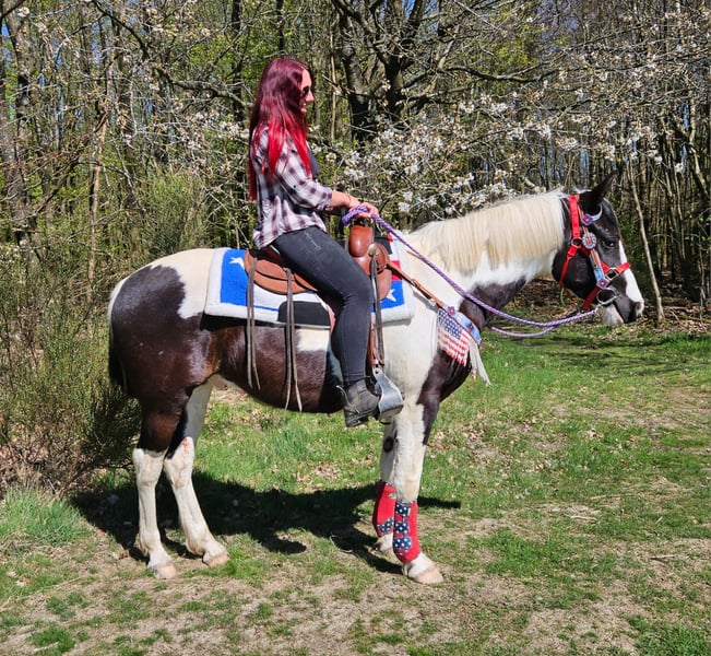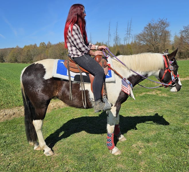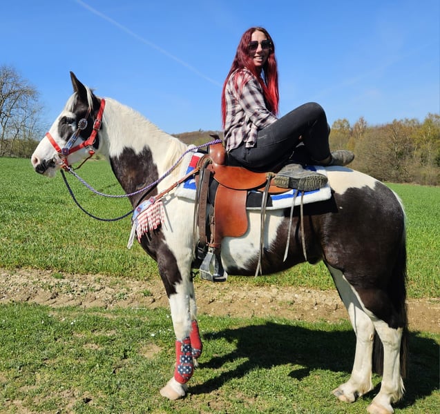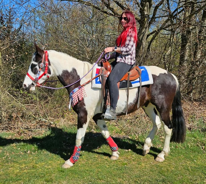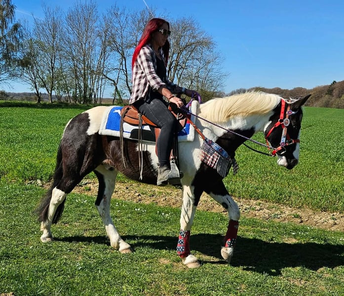 Junger Paint Wallach (geb. 2023) ROMEO in auffälliger Schwarzscheckung sucht sein neues Zuhause Ein echter Hingucker mit tollem Körperbau und freundlichem, aufgeschlossenem Wesen. Im Umgang zeigt er sich brav, menschenbezogen und angenehm unkompliziert. Er ist geritten, dabei zuverlässig und zeigt sich bereits jetzt gelassen und nervenstark. Auch im Gelände macht er seine Sache gut – ob alleine oder in der Gruppe. Offenstallhaltung ist ihm bekannt und bereitet ihm keinerlei Probleme. Ein vielseitig veranlagter junger Wallach mit viel Potenzial für die Zukunft – ideal für Freizeit und weitere Ausbildung. Romeo 3J. stm.1,56 AKU dabei , E-Paß 7400.- geritten zuverlässig & ausgeglichen geländesicher, auch alleine nervenstark Offenstall gewohnt harmonischer, kräftiger Körperbau vielseitig einsetzbar Ein junger Wallach mit Ausstrahlung, Charakter und viel Potenzial – ein echter Partner für die Zukunft. Pflege & Betreuung: – Regelmäßig entwurmt – Schmied gepflegt – Osteopathisch betreut Zusatzangebote: Westernsättel, Trensen und weiteres Zubehör erhältlich. Service: AKU dabei , stm. 1,56 E-Paß 7400,- – Transport kann organisiert werden – 3 Monate Umtauschrecht Proberitt: – 35 € (jedes weitere Pferd 25 €) – Wird beim Kauf am selben Tag angerechnet Preisnachlass bei sofortiger Mitnahme oder Transport am gleichen Tag: – Kategorie 1: 100 € – Kategorie 2 (ab 5.000 €): 250 € Telefon: 0171 – 4001968 Täglich erreichbar von 8–20 Uhr Keine E-Mail oder WhatsApp Alle Angaben ohne Gewähr
