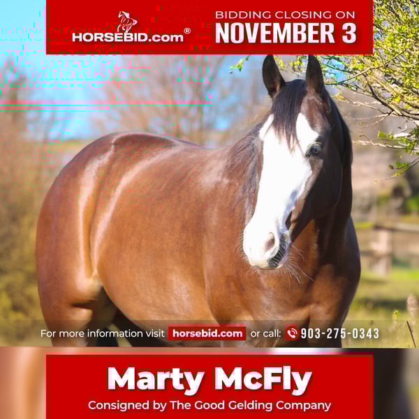 ⚜️𝐓𝐇𝐄 𝐅𝐀𝐋𝐋 𝐇𝐄𝐑𝐈𝐓𝐀𝐆𝐄 𝐂𝐋𝐀𝐒𝐒𝐈𝐂⚜️ Happening now thru MONDAY | NOVEMBER 3rd - Available EXCLUSIVELY on HorseBid's website! For more details and to register visit: www.Horsebid.com CONSIGNOR CONTACT: The Good Gelding Company 903-275-0343 LOCATION: Athens, TX BREED: Paint REGISTERED: Yes REGISTERED NAME: The Future COLOR: Bay HEIGHT: 15 AGE: 4 GENDER: Gelding 4-year-old | 15 hands | APHA Bay Paint Gelding “The Future” — better known around the barn as Marty McFly — is a young gelding with the kind of training, temperament, and polish that you don’t often find at just four years old. If you’re looking for a young gelding with the mind of an old soul — Marty’s your guy. “The Future” is as classy as he is kind. He’s got that tiny babydoll jog that’ll melt your heart, a slow lope that feels like a rocking chair, and he carries himself on a loose rein like he’s been doing it for years. Marty rides both English and western, pops over jumps, and loves hitting the trails. He has that finished show horse feel. He’s the kind you can’t help but fall for — quiet, good-minded, and the same every ride. Marty has all the buttons, all the looks, and all the personality to match. This gelding has been thoughtfully started and correctly brought along. Whether you’re looking for your next all-around partner, a prospect for the show pen, or a trustworthy trail companion, The Future has the foundation and the mindset to go in any direction. He’s young, fancy, and ready to make his next person proud — hop in, because The Future looks pretty bright with this one. ✨