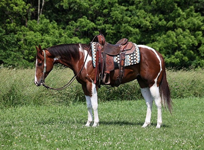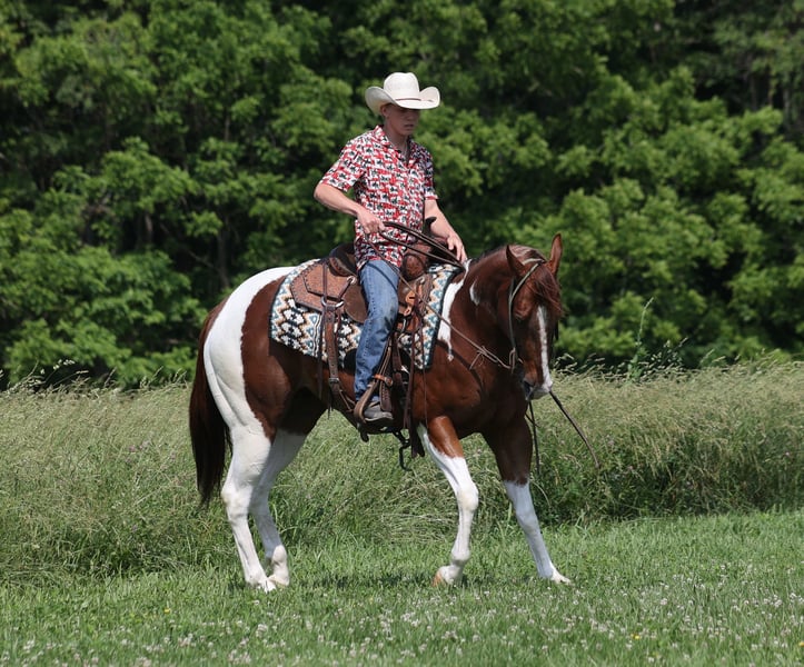 ONLINE AUCTION Place your bids at www.PlatinumEquineAuction.com Starting Bid $3500 Auction ends June 9th, 2024 Need a new saddle? Check out White Rock Saddles on our website or Facebook! Isaac is a well built Chestnut Tobiano gelding standing around 15-15.1hh and he is 4 years old. Issac has been used around the ranch and he has done some of everything. He is handy enough for sorting or he can go out in the pasture and be roped off of! Isaac is an excellent trail horse and has been ridden in multiple states from Texas to Kentucky. He will cross creeks, ditches, logs and navigate rough rocky areas. He is safe riding in traffic. He has a smooth jog, a very smooth lope, has a good stop, turns a circle both ways and backs with ease! Isaac is a confident horse on the trails and will lead the crew, head out alone with no issues! He has been exposed to all kinds of wildlife such as deer or turkey or other animals like cows or dogs and will go anywhere that he is asked too. He has been rode many miles in the mountains of Eastern Kentucky and encountered every obstacle possible on the trail. He will go up or down even the steepest slopes, across deep creeks, over downed trees, and over all types of rough terrain while still being sure footed. Isaac is not cinchy, cold backed, does not crib or weave. Issac has his whole life ahead of him and is looking for a partner to hit the trails with or a ranch to call home!!! Feel free to call Moore Trained Horses Logan 765-265-0033 with any questions. Located in Level Green, KY. ONLINE AUCTION Place your bids at www.PlatinumEquineAuction.com Starting Bid $3500 Auction ends June 9th, 2024 Need a new saddle? Check out White Rock Saddles on our website or Facebook!