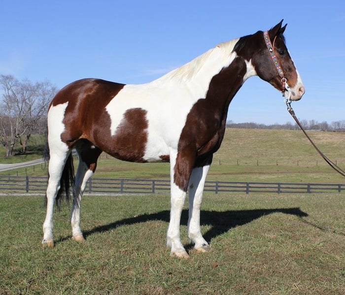 Alamo is a 15.1hh, 9 yr old, stout built, Bay Tobiano Paint Quarter horse gelding. He is a big stout built horse that weighs around 1200lbs and will carry any size rider. Alamo was born and raised in South Texas and he has been used in all aspects of ranch work from roping to sorting. Alamo has been trail ridden in multiple states throughout the west including Texas, New Mexico, Oklahoma, Wyoming, Montana and he has saw everything possible on the trails or ranch. He is a using horse and not a pet although he will follow you around like a dog if he knows you. He will cross creeks, ditches, logs and navigate rough rocky areas. He is safe riding in traffic whether that be semi-trucks or cars. He has a smooth jog, his lope is slow and easy as well, he stops nicely, will back and sidepass! You can lope him around or even put him in a full gallop and he will calm right back down and walk quietly as soon as he is asked. Alamo rides fine and would be good for most beginners to ride. He has been exposed to all kinds of wildlife such as deer or turkey or other animals like cows or dogs and will go anywhere that he is asked too. He has been rode many miles in the mountains of Eastern Kentucky and encountered every obstacle possible on the trail. He will go up or down even the steepest slopes, across deep creeks, over downed trees, and over all types of rough terrain while still being sure footed. Alamo is not cinchy, cold backed, does not crib or weave. Alamo is a big stylish looking gelding that rides the right way so anyone should enjoy him! Feel free to call +13039908552 with any questions!