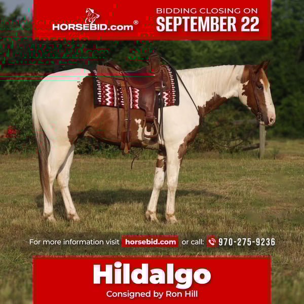 🍁𝒕𝒉𝒆 𝐅𝐀𝐋𝐋 𝑺𝒑𝒆𝒄𝒕𝒂𝒄𝒖𝒍𝒂𝒓🍁 Happening now thru MONDAY | SEPTEMBER 22nd - Available EXCLUSIVELY on HorseBid's website! For more details and to register visit: www.Horsebid.com CONSIGNOR CONTACT: Ron Hill 970-275-9236 LOCATION: Mount Vernon TX BREED: American Paint REGISTERED: Yes REGISTERED NAME: Peptos frosty cat COLOR: Sorrel tobiano HEIGHT: 15 AGE: 6 GENDER: Gelding Looking for a horse that’s as versatile as he is eye-catching? Meet Hidalgo, a stunning 6-year-old registered Paint gelding who rides as good as he looks — in both English and Western tack. Whether you’re in the show pen, the branding pen, or just out for a relaxing ride, this guy is ready to go to work and happy to do it. Hidalgo shines in the arena with a beautifully collected walk, trot, and lope, smooth lead departures, and a calm, balanced demeanor. He’s easy in his stops, backs with light pressure, and reverses without fuss. Hidalgo is great over the ground poles, and he jumps 2’6” effortlessly with natural form. He’s not just a pretty gelding — Hidalgo has spent serious time outside doctoring sick calves, gathering vast pastures, and handling big country with confidence. He’s reliable, sure-footed, and knows what a day’s work looks like, yet stays soft, responsive, and always aims to please. 6 years old and built to last. Registered Paint with unique color and confirmation to match. Great mind – calm, collected, and people-oriented. Transitions between disciplines like a pro. The kind you can ranch on all week and take to a show or trail ride on the weekend. Whether you’re jumping, ranching, trail riding, or just enjoying time in the saddle, Hidalgo brings the talent, temperament, and try you’ve been searching for.