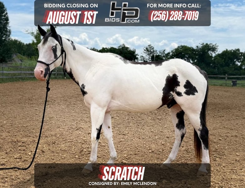 🔥MIDSUMMER CLASSIC 🔥 Happening NOW thru August 1st - Available EXCLUSIVELY on HP Bid’s website! For more details and to register visit: https://hpbids.com CONSIGNOR CONTACT: EMILY MCLENDON - (256) 288-7019 LOCATION: New Hope, AL BREED: Paint REGISTERED: No REGISTERED NAME: N/A COLOR: Tovero HEIGHT: 15 AGE: 7 GENDER: Gelding Do you have an itch that you need to scratch? Meet Scratch a kind, well-started 7-year-old Paint gelding with a great mind and a solid foundation. Scratch had a later start in life but is broke walk, trot, and lope under saddle and is currently learning softness, side passing, and basic lateral movements. He’s a sensitive and willing partner with a quiet disposition, making him an ideal fit for a confident rider looking to put the finishing touches on a quality horse. Scratch is respectful on the ground, easy to catch, and has been started right. While he did offer a few small bucks early on at the canter when first started, that has not been an issue as he’s progressed and gotten stronger. He continues to improve with each ride and shows no silliness or resistance when worked consistently. This gelding has the kind of brain and foundation that would really shine in a western ranch or working home. He’s soft, alert, and wants to have a job! Whether that’s trail riding, ranch riding, day work, or just being someone’s all-around partner. ✅ W/T/L under saddle ✅ Softening to the bit ✅ Side pass and lateral work started ✅ Excellent ground manners ✅ Calm, people-oriented, and responsive to cues ✅ Sound and healthy Scratch is clean-legged, UTD on all care, and ready to continue his education with someone who appreciates a good-minded gelding with try and potential. I’d love to see him go to a western home where he’ll have a purpose and keep learning. Transport available. PPE welcome at buyer’s expense. Contact Emily if you have any more questions or for videos at 256-288-7019!