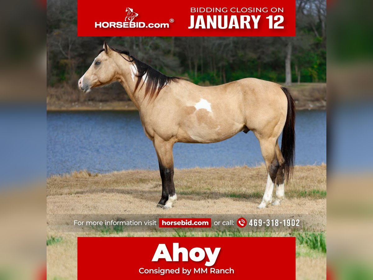 ♦️𝐍𝐄𝐖 𝐘𝐄𝐀𝐑'𝐒 𝑬𝒙𝒕𝒓𝒂𝒗𝒂𝒈𝒂𝒏𝒛𝒂♦️ Happening now thru MONDAY | JANUARY 12th - Available EXCLUSIVELY on HorseBid's website! For more details and to register visit: www.Horsebid.com CONSIGNOR CONTACT: MM Ranch 469-318-1902 LOCATION: Forney, TX BREED: APHA REGISTERED: Yes REGISTERED NAME: GRANDE LIFE FOR ME COLOR: Buckskin Overo HEIGHT: 15.2 AGE: 7 GENDER: Gelding 🏴☠️🏴☠️ This is Ahoy. 🏴☠️🏴☠️(His dad’s name is Pirate and his registered name is a Grande Life For Me.. so it seemed fitting.) 🏴☠️🏴☠️Ahoy is a gorgeous buckskin paint gelding you can take to the shows or hit the trails on and truly enjoy. He is hands down a perfect all around horse!!!! He is SAFE for anyone to ride. He is at the perfect age of just 7 yrs old. He stands 15.2 hands tall.🏴☠️🏴☠️ 👉🏼SHOW EXPERIENCE: Ahoy is a natural in the show ring. Very comfortable. He's been shown at the local shows in western pleasure classes and ranch trail classes. Just local shows for fun. Ahoy is the type you can enjoy and learn on. He's responsive to your seat and leg but not overly responsive or overly sensitive. He will go just as fast or as slow as you'd like. He's got a comfortable easy and comfortable rocking chair lope, knows his leads, an easy stop, and turns around correct and pretty. 👉🏼ENGLISH EXPERIENCE: Ahoy also rides English and goes over the little jumps. He's so open minded and willing you could take him to the hunter classes and really hold your own! He packs his head low and correct and goes right to the jumps! Very pretty mover. 👉🏼TRAIL EXPERIENCE: He loves to trail ride!! Down the road, through the woods or take him swimming! He loves going new places!! He doesn't mind traffic, dogs or wildlife. He goes up and down the big hills carefully and easily and he goes right into the water! He loves to play and splash in the river! He will ride front, middle or back of the pack. Not at all buddy soured if you like going out on the trails alone. 👉🏼DISPOSITION: Ahoy is extremely sweet and loves being loved on. He comes right to you and puts his head in the halter. He loves kisses and having his ears scratched. He is very quiet and easy to ride and be around. He's got a very go with flow way about him. He doesn't get upset when his rider gets off balance or in his face. He's very forgiving if you mess up or give the wrong command. He would really make an excellent addition to a lesson program just cause he is so easy. 👉🏼UPKEEP: Ahoy is an easy keeper. He's currently eating alfalfa hay. He is UTD on everything. He does perfect barefoot or shod. Doesnt matter to him. Has good hard solid feet. We just put shoes on him this round to take him and ride him through the rocky trails. 👉🏼LOADING: Ahoy loads and hauls like a dream. Very quiet and patient in and out of the trailer. He stands quietly tied to the trailer at the horse shows. No pawing or throwing a fit if left alone either. So makes it so easy if you want to go to the shows or trail rides with just one horse. 👉🏼TURNOUT: He can be by himself or in a group in the pasture. We've had him out with mares, geldings, mini ponies, mini cows, mini donkeys, etc.. without any fussing or drama. He is middle of the pecking order. Gets along with everyone. 👉🏼GROUND MANNERS: He is great on the ground. Respectful of personal space. He stands like a dream for grooming, washing, saddling, mounting block and he takes the bit easily. He will stand single tied and crosstied. Doesn't mind dogs, goats, small children around his feet. 👉🏼BAD HABITS/ VICES: Ahoy has absolutely NO bad habits or vices. Absolutely no buck, no rear, no bolt, no bite, or no kick. I cannot say it enough, this horse is a saint!!! He does not need to be warmed up or tuned up before you can go for a ride either. You can catch him straight out of the pasture and get on him. Even if it has been a few months since you rode him last. That’s a big plus in our books because life gets busy and sometimes it’s hard to make time to ride everyday. With him you don’t have to worry about that. 👉🏼TACK: We've ridden Ahoy in anything from a halter and lead rope to a snaffle to a correction bit. Our go to bit of choice for him is a medium shank snaffle. English, western, bareback, backwards, sideways, forward, doesn’t matter to him. As long as he is getting attention from you he is happy!! 👉🏼SHIPPING: we can and will help arrange affordable shipping anywhere. We will provide a new coggins when sold. He is up to date on all shots, feet, teeth, etc.. He is 100% ready for his new home. Ready to be rode and enjoyed.