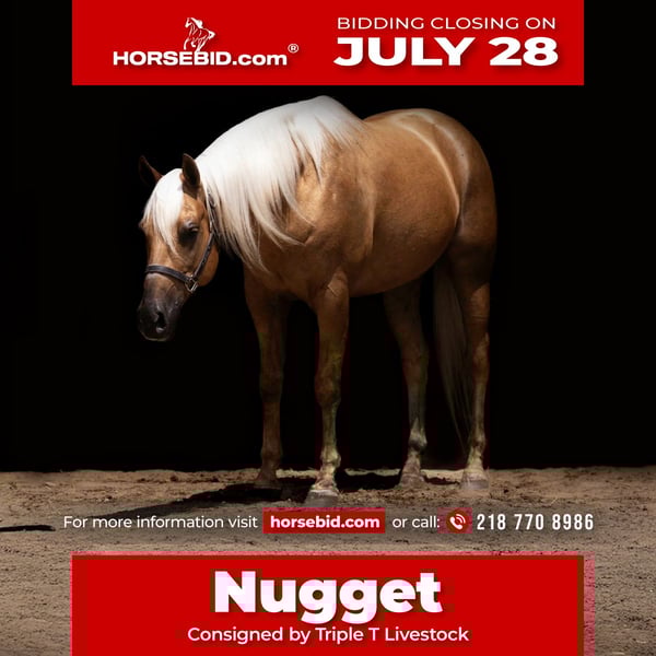 ⚔️ The HORSEMAN's Select ⚔️ Happening now thru MONDAY | JULY 28th - Available EXCLUSIVELY on HorseBid's website! For more details and to register visit: www.Horsebid.com CONSIGNOR CONTACT: Triple T Livestock 218 770 8986 LOCATION: Nevis MN BREED: APHA REGISTERED: Yes REGISTERED NAME: Dunitwithasmartchic COLOR: Palomino HEIGHT: 15 AGE: 8 GENDER: Gelding Nugget is a striking golden palomino gelding that shines just as bright in the arena as he does out on the trail. Standing a solid and balanced 15 hands, he is the perfect size for both youth and adults, and his charming personality makes him instantly likable. Nugget is incredibly kind, the type of horse that meets you at the gate with a soft eye and an eager heart. He is gentle to be around, easy to handle, and truly enjoys being someone’s partner, whether it’s for a casual ride or a competitive outing. Under saddle, Nugget is impeccably trained and a true pleasure to ride. He performs all the reining maneuvers with style and correctness—he spins with cadence, has a big stop, and circles with fluidity and collection. His lope departures are smooth and effortless, and his body control is exceptional. He’s light in the bridle, rides off your seat and legs, and responds with softness and willingness. Nugget makes it easy for his rider to look good, and his training sets him apart as a mount capable of excelling in the show pen or stepping into any performance direction. Outside the arena, Nugget proves just how versatile he is. He is a confident, steady partner on the trail, surefooted and willing to go anywhere you point him. Whether it’s crossing water, navigating steep terrain, or riding through town, Nugget takes it all in stride. He’s accustomed to dogs, pigs, bicycles, traffic, tarps, and all the chaos that comes with life on a busy ranch. Nothing rattles this gelding—he’s been there, done that, and is always game for more. With his combination of looks, talent, and temperament, Nugget is the kind of horse that’s hard to find. He would truly shine in ranch versatility events, trail classes, 4H shows, or simply as a dependable partner for everyday riding. Whether you’re a competitive rider looking for a fun and capable show horse or a family needing a reliable, gentle gelding, Nugget checks all the boxes. He is as sweet as he is talented, and he’s ready to make someone very proud.