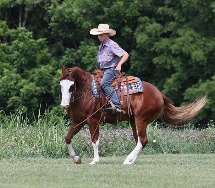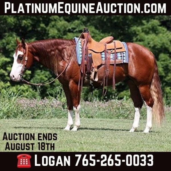 ONLINE AUCTION Place your bids at www.PlatinumEquineAuction.com Starting Bid $3500 Auction ends August 18th, 2024 Need a new saddle? Check out White Rock Saddles on our website or Facebook! All’s Lip Smacking Good aka Smack is a stout built Chestnut Overo horse standing around 15.1hh and he is a 2018 Model Registered APHA Gelding. He has an excellent pedigree going back to the famous Topsail Whiz who is an AQHA Hall Of Famer who has sired over $12 Million Dollars in offspring. The Topsail Whiz bloodline is well known throughout the reining world and also in the cowhorse world. Since owning Smack he has been used at the stockyards to pen cattle, we’ve had him out in the pasture gathering cattle and he has roped a couple as well. He has been started on the roping dummy and is doing a good job tracking it. He knows his way around the ranch and has plenty of cow sense. Smack is an excellent horse to take for a relaxing trail ride as he is great on trails and he will cross creeks, ditches, logs and navigate rough rocky areas. He has a smooth jog, a VERY VERY nice easy to set lope, a good stop, turns a circle both ways and backs with ease! Smack has had some reining training and would be an excellent horse to enter the show pen in the ranch horse classes. He rides with his head low and will keep a loose/draped rein. He has been exposed to all kinds of wildlife. He will go up or down steep slopes, across deep creeks, over downed trees, and over all types of rough terrain while still being sure footed. He has been ridden through town and is safe in traffic is not spooky. Smack is an excellent horse for any job around the ranch or trails! He is located in Level Green, KY. Feel free to call Moore Trained Horses Logan 765-265-0033 with any questions. ONLINE AUCTION Place your bids at www.PlatinumEquineAuction.com Starting Bid $3500 Auction ends August 18th, 2024 Need a new saddle? Check out White Rock Saddles on our website or Facebook!