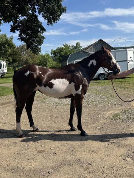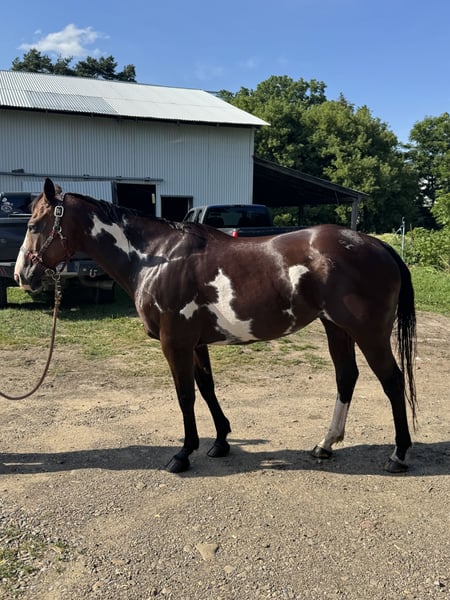Yegua pintada de grado. El veterinario estimó su edad en 12/13 años. Mide alrededor de 15 manos. Comprada de un "rescate de última oportunidad". Necesita ganar algo de peso, pero se ve decente considerando de dónde viene. Es una yegua de proyecto. NO es para un aficionado principiante. Esta yegua es un diamante en la tierra para alguien que tenga paciencia y voluntad. Actúa como si alguien no hubiera sido muy amable con ella, es un poco asustadiza con la cabeza, pero le encanta la atención una vez que ve que eres amable con ella. Necesita seguir trabajando en levantar sus patas, pero está mejorando mucho. Monta, pero lo hace VERDE. Sabe muy poco, pero actualmente puede caminar y trotar. Al día con coggins, dental, desparasitaciones y herrador.