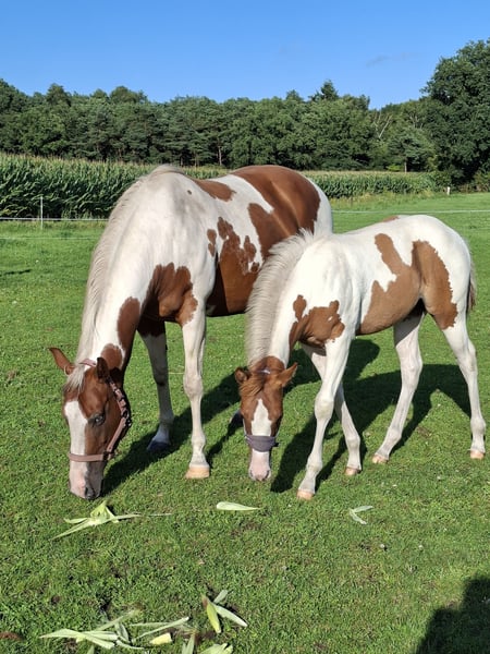 Paint Horse Absetzer Stute HAPPY BUMBLEBEE Red Dun Tobiano Geb. April 2025. Paneel 6n/n Das kleine red Dun Mädchen ist sehr Menschen bezogen und beherrscht schon das Fohlen ABC, den Schmied und das Anhänger fahren. Sie wird ca 150 bis 153 groß, ihre Mutter ist Continental Bumblebee und ihr Vater Jeannes Happy Ligth. Sie steht auf großen Weiden mit anderen Fohlen und mehreren Stuten. Sie verfügt über ein kräftiges Fundament und gute Veranlagung für den Reining oder Allround Sport. Hat einen Pass von PHCG und ein Papier von der APHA. Sie ist bereits abgesetzt und könnte in ihr neues Zuhause umziehen In fördernde Hände abzugeben Platz vor Preis Anzeige im Auftrag erstellt