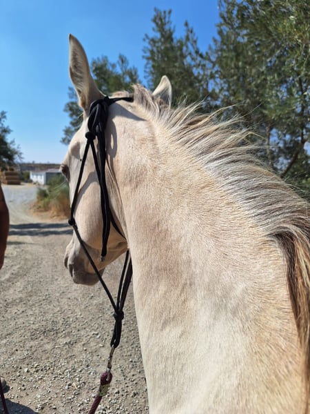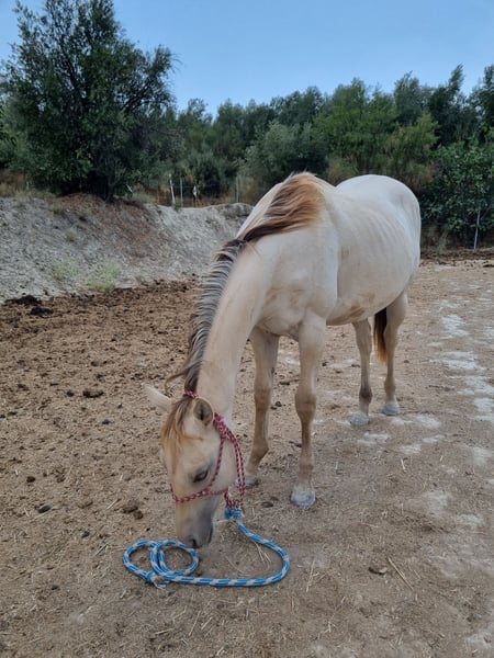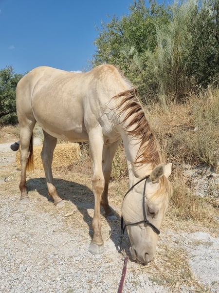 Magnífica potra registrada APHA con muy buenos orígenes, Champagne Dun. Tiene un carácter muy bueno, es fácil en grupo y con los humanos. Posibilidad de ayudar con el transporte si la salida es rápida.