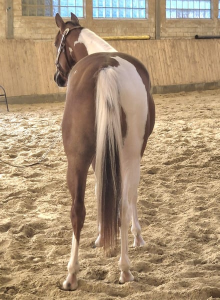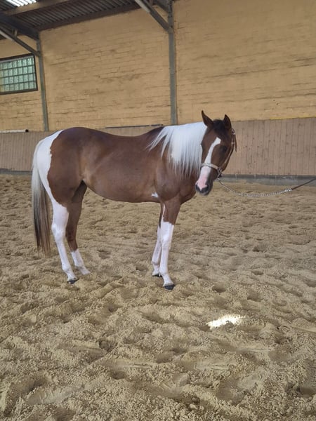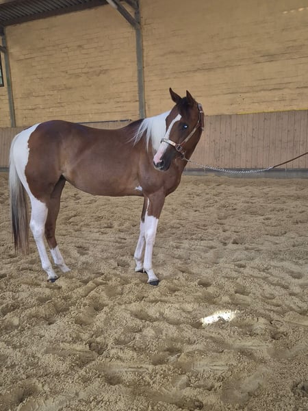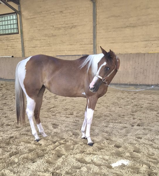 Super schicke 2-jährige Paint Horse Stute mit sehr guter Abstammung zu verkaufen. Sehr schöne Farbzeichnung. Spielerisch mit etwas Bodenarbeit begonnen. Geht als Handpferd mit ins Gelände. Platz vor Preis Für weitere Informationen können Sie sich gerne per Mail oder telefonisch melden. Am 20.10.2025 wurden die Zähne gemacht und sie wurde geimpft.