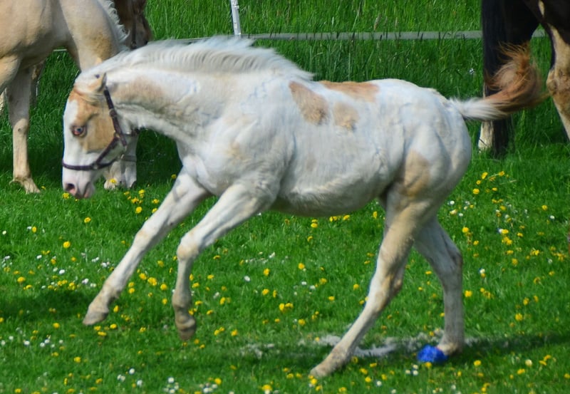 Lyria is a beautiful Paint Horse bag in Gold Dun Champagne Tovero, with two steel blue eyes. Born 03.06.2023 She is cuddly, sweet, and well-behaved. He likes to have his hoof on the accelerator pedal and dashes across the paddock. Shows her amazing talent for speed control, canter changes and stops! She is about the parents 7 panel N/N. Lyria won the PHCG filly show with an overall score of 8.0.