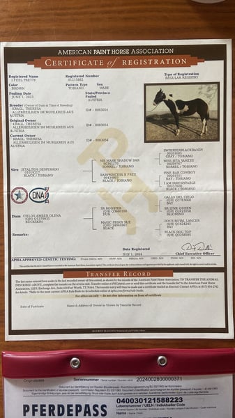 **Sales Advertisement: Beautiful Paint Horse Mare for Sale!** I am offering a charming Paint Horse mare for sale. **Features:** - **Breed:** Paint Horse - **Gender:** Mare - **Date of Birth:** 01/06/2023 - **Coloring:** Tobiano brown - **Estimated Final Height:** 155 cm - **Discipline:** Western, Leisure, Therapy, Breeding This talented mare impresses not only with her striking coloring but also with her friendly character and openness. She learns as quickly as her QH mother (3rd picture). She is ideally suited for Western riding and has the potential, with proper training, to cover a wide range of activities for her future owner. She is well-socialized and is growing up in a mixed herd in a paddock. Perfect for riders looking for a reliable and loving horse that brings joy both in training and leisure. If you are interested or have any questions, I look forward to your message! Viewings are possible by appointment. 5 Panel N/N