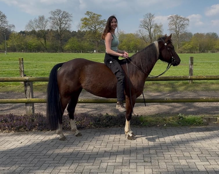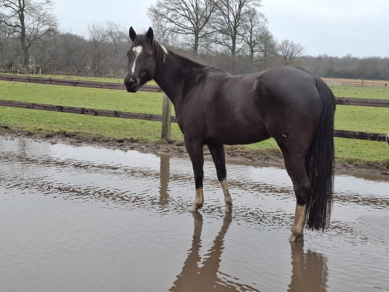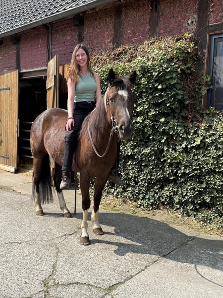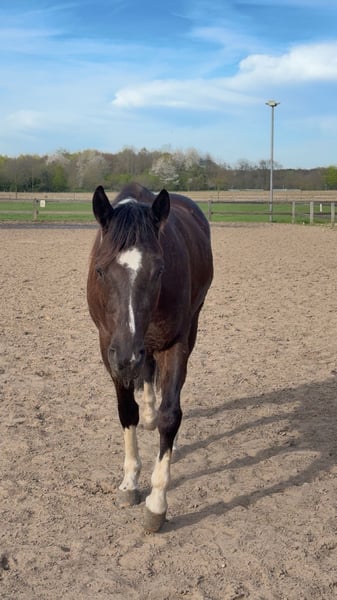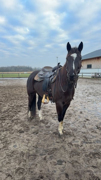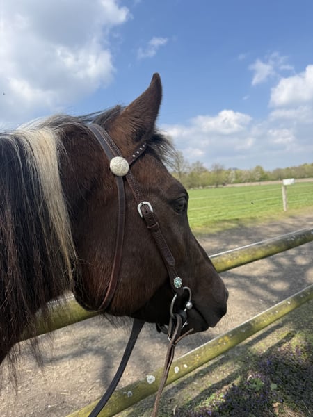 Met pijn in het hart moet ik mij wegens tijds- en financiële redenen helaas van mijn 5-jarige Painthorse merrie Malou scheiden. - 5 jaar oud en ongeveer 1,58 m hoog - Zippo/tiefdonkerbruine kleur met een witte vlek op de hals en manen, en vier witte benen - Gecertificeerd Painthorse veulen - Direct afstammeling van de Painthorse hengst Magic on Ice - Western getraind (zowel bitloos als met bit) - Heeft ervaring in het buitenritten maken; onder het zadel heeft ze al in alle gangen in het terrein gelopen, maar vanwege haar leeftijd heeft ze daar nog wat meer vertrouwen nodig - Foutstand (ze rolt met beide voorbenen van buiten naar binnen en heeft daarom hoefbeslag nodig; een speciaal hoeforthopedisch hoefbeslag is niet noodzakelijk) - Begonnen met vrijheidsdressuur - Bij mij verder opgeleid volgens het ProRode horsemanship-concept - Komt uit een Painthorse fokkerij uit Zwitserland Ik zoek iemand die Malou in haar vrije tijd wil rijden en werken. Ze staat momenteel in een kleine kudde in een paddock met uitloop. Accessoires kunnen tegen meerprijs worden meegegeven. Voor meer informatie, foto's/video's of een persoonlijk telefoongesprek, neem gerust contact op!