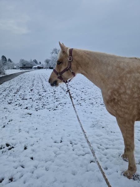 Unsere liebe Holly ist eine Stute mit einem ganz besonderen Wesen. Sie ist freundlich, feinfühlig und zeigt im täglichen Umgang eine angenehme Ruhe. Nicht schreckhaft, klar im Kopf und sehr menschenbezogen- eine treue Seele, die ihrem Menschen gefallen möchte. Beim Einreiten hat sie sich von Anfang an kooperativ und mutig gezeigt. Sie war über den Sommer drei Monate im Beritt und wird aktuell von mir (Trainer B Westernreiten) weiter ausgebildet. Besonders im Gelände fühlt sie sich wohl- sie geht neugierig und entspannt, sowohl allein als auch in der Gruppe. Holly braucht etwas Zeit, um sich auf neue Menschen einzulassen- mit ihrer Bezugsperson zeigt sie jedoch ihr volles Vertrauen und arbeitet motiviert mit. Für jemanden, der ihr dieses Vertrauen schenkt, wird sie ein wundervolles Pferd mit großem Herz. Wir wünschen uns für Holly ein liebevolles Zuhause bei Menschen, die Erfahrung, Geduld und ein Herz für besondere Pferde mitbringen. bei Interesse freuen wir uns über eine Nachricht und ein persönliches Kennenlernen! Ein passender Sattel und weiteres Equipment können ebenfalls erworben werden.