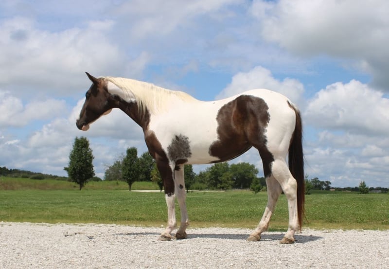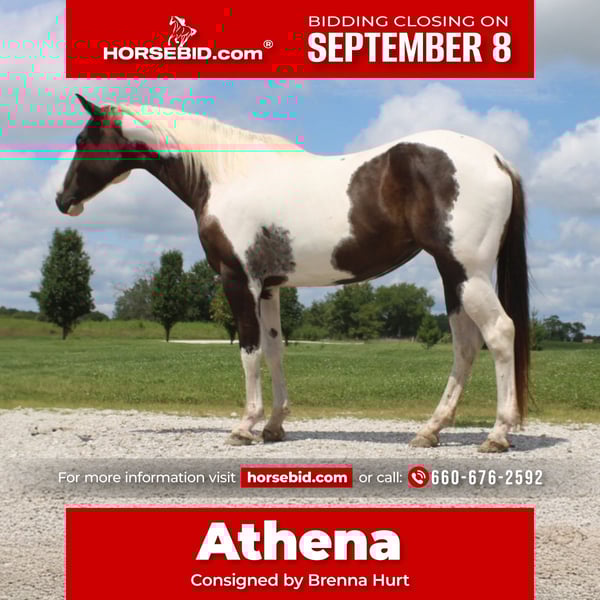 ♦️ 𝐭𝐡𝐞 𝐒𝐞𝐩𝐭𝐞𝐦𝐛𝐞𝐫 𝑺𝒆𝒍𝒆𝒄𝒕 ♦️ Happening now thru MONDAY | SEPTEMBER 8th - Available EXCLUSIVELY on HorseBid's website! For more details and to register visit: www.Horsebid.com CONSIGNOR CONTACT: Brenna Hurt 660-676-2592 LOCATION: Macon, MO BREED: APHA REGISTERED: Yes REGISTERED NAME: COLOR: Black and White Tobiano HEIGHT: 15.2 AGE: 7 GENDER: Mare It’s not everyday you find one that checks all the boxes, young, sound, Registered, broke, gentle, and FLASHY! I’m happy to introduce you to a gal that will check every box on your list and then some! Athena is a 7 year old APHA registered, black & white, Tobiano paint mare who stands 15.2 hands tall. The first word that comes to mind when I’m around this horse is smoke-show. She is that girl truthfully! Her long legs, gorgeous movement, and tricked out paint job is a head turner everywhere she goes! From the arena, camping trips, trail rides, barrel races, or even a Saturday night cruise down the strip. Her calm cool demeanor and athleticism will make anyone look, and feel like a million bucks. She’s not only the type of mare that just makes it look easy, she is easy! I can’t think of a single situation this mare hasn’t been a pleasant to be around. She’s extremely gentle to catch, lead, load, bathe, shoe, saddle, ect. Doesn’t bat an eye at any critters and gets alot great with her pals! Under saddle, this mare is a Cadillac. I might just be biased, but I truthfully feel that her potential is uncapped. Any button you could ask for is there, she is super soft and super smart making her the ultimate prospect for just about anything & everything your heart desires! Athena has been with the same family since she was 1.5 years old, there are no tricks to this one. This sweetheart has always proven herself to be safe & trustworthy and will be very missed, but we have full confidence in her ability to succeed in whatever her new home sees fit! Be sure to check out some of her adventures in her Video & don’t be shy to come see her and start taking her on some of your own! Feel free to call Brenna Hurt at (660) 676-2592 for any further information.