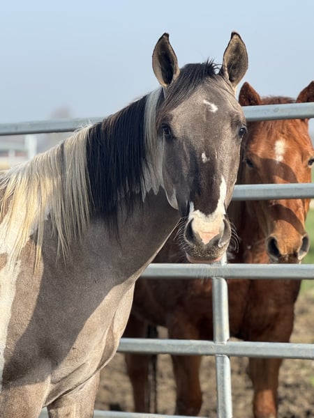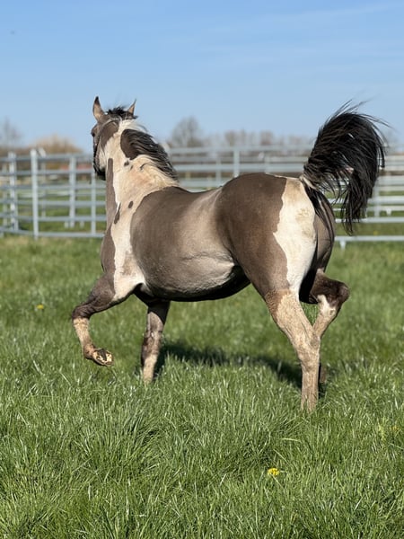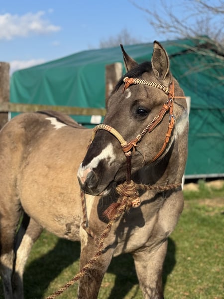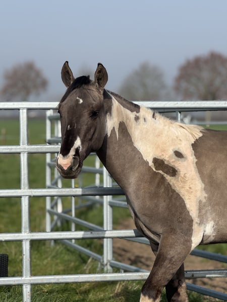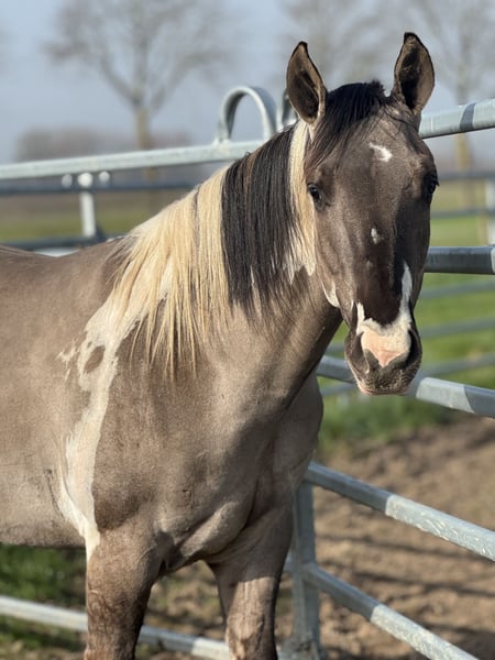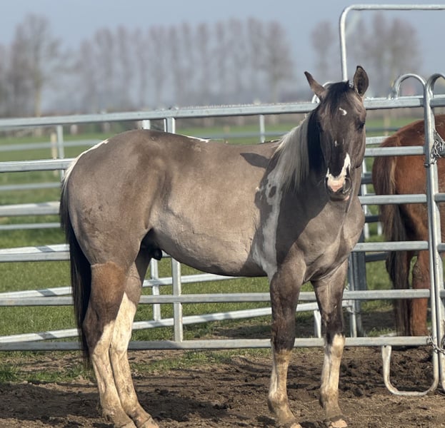 This beautiful stallion will turn 2 years old in July and has an incredibly sweet, gentle, and affectionate character. He is a very well-mannered stallion who almost seems unaware that he is a stallion. In handling he is calm, people-oriented, and very pleasant to work with. He is social with other horses, behaves well in the herd, and also enjoys going for walks outside in hand. He is already familiar with groundwork and learns new things quickly. He is also genetically very interesting for breeding. He has been Panel 7 tested and carries special color genes: • APHA with papers and BQHA passport • Double homozygous • Homozygous black • Homozygous tobiano This means he will always pass on the tobiano pattern and has a 50% chance of passing on the dun gene. In short: a super sweet, very well-behaved, and genetically interesting stallion with a bright future.