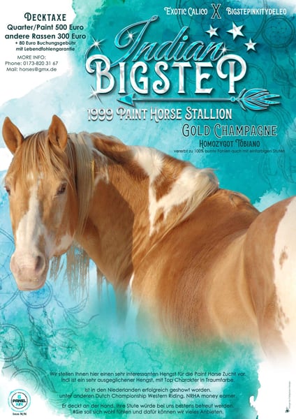 🔱🔱🔱INDIAN BIGSTEP 🔱🔱🔱 American Paint Horse Deckhengst Steht in 2026 wieder im Natursprung zur Verfügung. ⚜️Gold Champagne ⚜️Homozygot Tobiano ( vererbt zu 100% bunte Fohlen auch mit einfarbigen Stuten) ⚜️geb. 1999 ⚜️STM. 154 cm ⚜️7 Panel N/N GBED N/N, HERDA N/N, PSSM1 N/N, MH N/N, HYPP N/N, MYH1 N/N Olws N/N Indi ist ein sehr ausgeglichener Hengst, mit Top Charakter in Traumfarbe. Was er auch an seine Fohlen vererbt, wie seine Nachzucht beweist. Und noch in seinem jungen Alter top Fit ❤️❤️❤️. Ist in den Niederlanden erfolgreich geshowt worden. unter anderen Dutch Championship Western riding, NRHA money earner. Decktaxe: 580 Euro QH / PH 380 Euro ZSSE