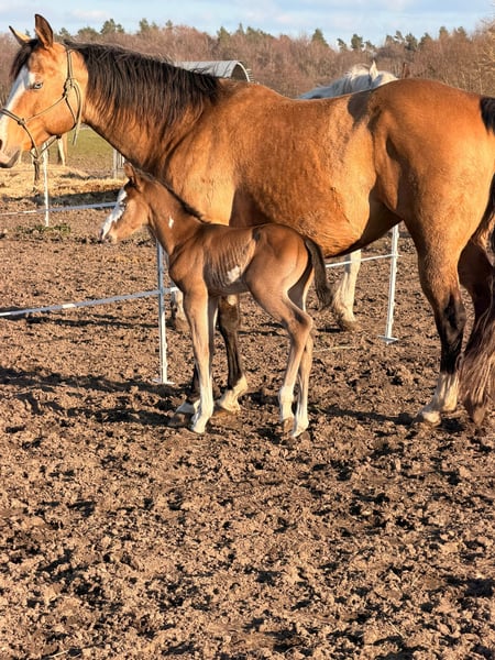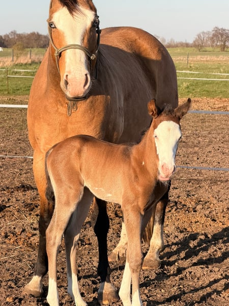 Hes A Diamond Chex ist ein hochwertiges Paint Horse Hengstfohlen, geboren am 29.03.2026, in der außergewöhnlichen Farbgebung bay dun overo splash (Farbtest läuft). Mit einem zu erwartenden Endmaß von ca. 153 cm präsentiert er sich als kompakter, korrekt gebauter und vielversprechender Nachwuchshengst mit guten Proportionen und viel Ausdruck. Dieses Hengstfohlen überzeugt nicht nur optisch als absoluter Eyecatcher, sondern auch durch seine natürliche Präsenz und seine lockere, elastische Bewegungsqualität. Durch seine interessante Abstammung eignet er sich besonders für den Reining- und Allroundbereich, ist ebenso für den ambitionierten Freizeit- oder Turnierreiter eine spannende Perspektive. Charakterlich zeigt er sich außergewöhnlich menschenbezogen, freundlich und unkompliziert. Er ist neugierig, clever und gleichzeitig gelassen in neuen Situationen. Typisch Fohlen bringt er eine fröhliche, leicht freche Art mit, bleibt dabei aber stets cool und nervenstark. Umweltreize wie Landmaschinen, Autos und alltägliche Geräusche kennt er bereits und nimmt diese völlig entspannt an. Hes A Diamond Chex wächst artgerecht im Herdenverband mit anderen Fohlen auf und wird hochwertig aufgezogen. Er erhält altersgerechtes Aufzuchtsfutter, ist regelmäßig entwurmt und gesundheitlich unauffällig. Der aktuelle 5-Panel-Test ist n/n. Im täglichen Umgang wird er konsequent, aber liebevoll gehändelt. Er kennt bereits den Tierarzt sowie den Hufschmied und wird ans Halfter gewöhnt. Das Fohlen-ABC wird kontinuierlich gefestigt. Zusätzlich kennt er das Verladen und fährt problemlos im Anhänger. Auch erste Ausflüge ins Gelände gehören bereits zu seiner Entwicklung. Dieses Paint Horse Hengstfohlen bringt beste Voraussetzungen für eine Zukunft im Sport sowie im gehobenen Freizeitbereich mit. Durch seinen Charakter, seine Nervenstärke und seine natürliche Coolness ist er sowohl für ambitionierte Turnierreiter als auch für Freizeit- und Familienpferdehalter interessant.