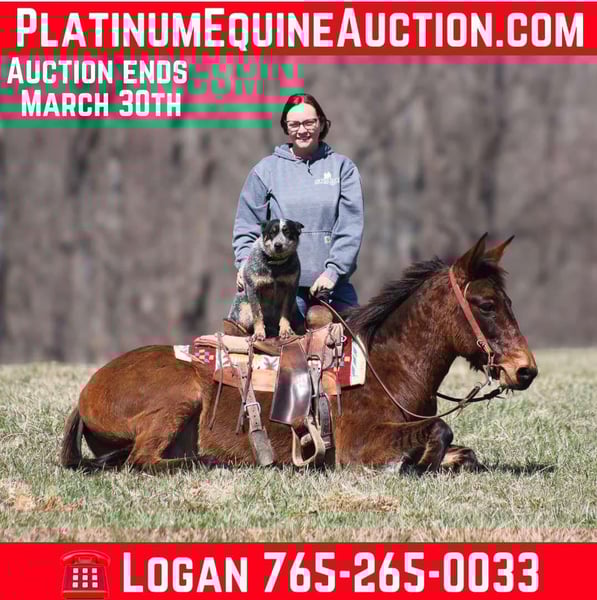 ONLINE AUCTION Place your bids at www.PlatinumEquineAuction.com Starting Bid $3500 Auction ends March 30th, 2025 Need a new saddle? Check out White Rock Saddles on our website or Facebook! Parker is a 13.2H, very stout built, 9 year old, Dun John Mule with Tiger stripes on his legs and he is one LAID BACK dude!!! Parker is quiet and gentle. He is great on trails, he rides through rough rocky terrain, dead fall, thick brush, deep water, you name it and Parker will go on through it while being surefooted. He has been used to coon hunt off of after dark, he has leg dogs and had guns shot off of his back. Parker is 100% content to just plod along slow and easy down the trails and is totally safe for timid or beginning riders. He is a great mule to help build someone’s confidence! Parker is safe on the highways and has been ridden around cows. I have started teaching him to lay down. He is easy to tack up, no issues with his ears or with his feet. Parker has been a joy to have around and he is sure to be a joy for his new family. Located in Brodhead, KY. Contact Moore Trained Horses Logan 765-265-0033 with any questions or to make a buy it now offer. ONLINE AUCTION Place your bids at www.PlatinumEquineAuction.com Starting Bid $3500 Auction ends March 30th, 2025 Need a new saddle? Check out White Rock Saddles on our website or Facebook!