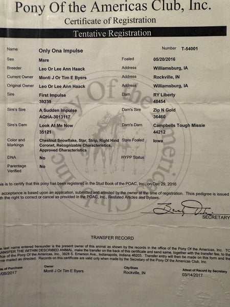 ONLINE AUCTION Place your bids at www.PlatinumEquineAuction.com Starting Bid $3500 Auction ends February 9th, 2025 Need a new saddle? Check out White Rock Saddles on our website or Facebook! ONLY ONA IMPULSE is a 13.2hh, 2016 model, registered POA, mare that is a head turner! Leanne is the definition of broke! She has a really fancy handle on her and a beautiful way of going. She has been shown in the western pleasure, but the ranch events will be where Leanne shines! She has beautiful gaits and will go any speed she is asked, a great stop, a really nice turn around, moves off leg pressure, neck reins, is soft in the bridle, and is always aiming to please. She is ready to start on the pattern classes and would even make a jam up reining pony! Leanne will be best suited for an intermediate rider or at least a rider with some guidance if they are less experienced. She has absolutely no bad habits or pony naughtiness!! She is just a super catty and quick footed girl that will respond to every queue that is given to her. She is super easy to catch, loves attention, will load and haul well in any trailer, good for the vet & farrier, stands tied, quiet to saddle and easy to bridle, and is a very easy keeper. Leanne is a thick girly and a very easy keeper. This pony is a true pleasure to be around. No mareish behavior at all and she is at the very bottom of the herd pecking order. She is easy to catch in the pasture but stalls really well too. This sweet girl deserves the absolute best home. UTD on everything. No health issues or maintenance. Leanne has great feet and is barefoot. Papers being updated to permanent. Leanne is sound and healthy in every way. Located in Dennison, IL. Contact Twisted S Company/Sarah Simpson 217-251-4501. ONLINE AUCTION Place your bids at www.PlatinumEquineAuction.com Starting Bid $3500 Auction ends February 9th, 2025 Need a new saddle? Check out White Rock Saddles on our website or Facebook!