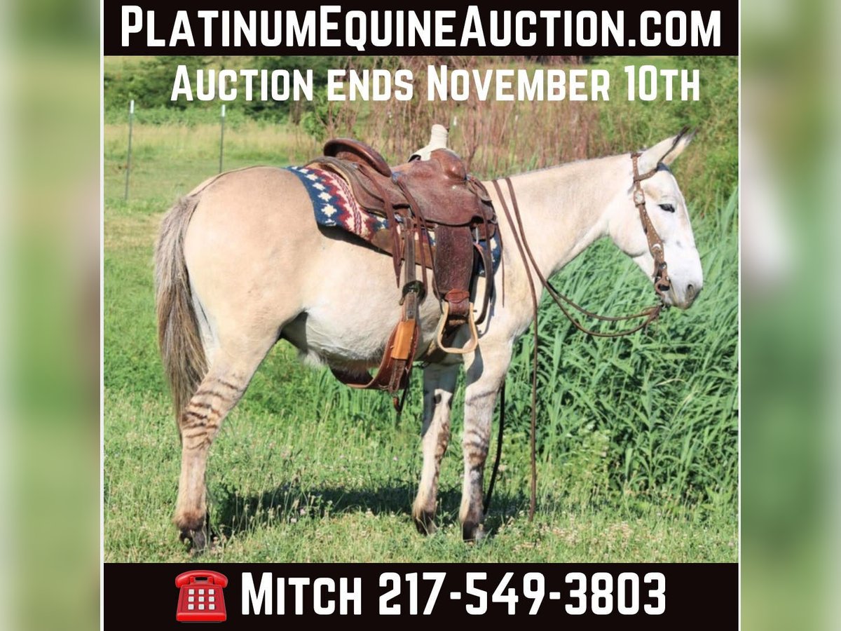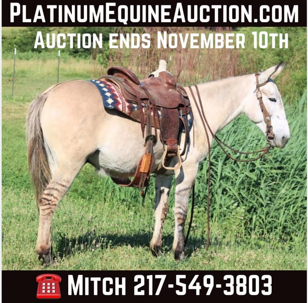 ONLINE AUCTION Place your bids at www.PlatinumEquineAuction.com Starting Bid $3500 Auction ends November 10th, 2024 Need a new saddle? Check out White Rock Saddles on our website or Facebook! Arthur is a fancy broke 8 yr old, 14.2h, zebra stripped grey dun john mule. Arthur has been ridden by my entire family, including kids aging from 4 to 14, he is kind and forgiving to newer, less experienced riders. He is willing to cross obstacles, water, logs, or anything else with a simple ask by his rider. He has been trail ridden all over the central united states including Caney Mountain, Arkansas, Emminance MO, and Shawnee National Forrest in Illinois. He handles the toughest of trails with a cool, confident demeanor. In Addition to trail riding, we have used him to rope and doctor calves, move pairs to different pastures, and ridden him to check fence lines. Arthur, neck reins one handed, side passes, lopes slow collected circles, slide stops, and back easily with collection. He has been desensitized with cards, flags, pool noodles, and umbrellas. He has great ground manners, walks with his handler and respects their space. He is great to handle his ears and feet as well. He trailers easily and will walk off the trailer or back off it. He rides in a regular QH bars saddle, has been ridden in a britchen , tail crouper, and pulling collar. He catches easily without feed. Arthur is a great mule, that will fit a first time mule family, or an experienced muleman/woman. It’s been an absolute please to own Arthur and Titus Equine is proud to offer him to the public. Watch his video and bid with confidence on this one of a kind colored, one of a kind attitude’d, quality john mule! Contact Titus Equine Mitch 217-549-3803 Located in Charleston, IL. ONLINE AUCTION Place your bids at www.PlatinumEquineAuction.com Starting Bid $3500 Auction ends November 10th, 2024 Need a new saddle? Check out White Rock Saddles on our website or Facebook!