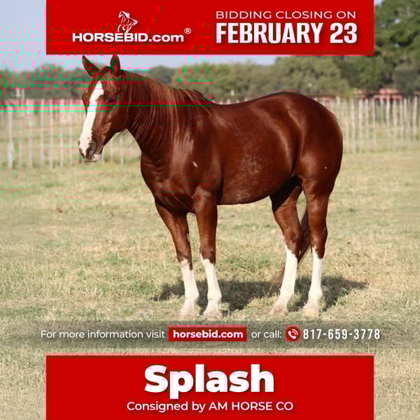 💎 𝐓𝐇𝐄 𝓓𝓲𝓪𝓶𝓸𝓷𝓭 𝐒𝐇𝐎𝐖𝐂𝐀𝐒𝐄 💎 Happening now thru MONDAY | FEBRUARY 23rd - Available EXCLUSIVELY on HorseBid's website! For more details and to register visit: www.Horsebid.com CONSIGNOR CONTACT: AM HORSE CO 817-659-3778 LOCATION: Mineral Wells, TX BREED: Quarter horse REGISTERED: No REGISTERED NAME: Splash COLOR: Sorrel HEIGHT: 14.2 AGE: 10 GENDER: Gelding The possibilities are absolutely endless with a horse like this! Splash 💦 is GRADE, just 10 years old, a perfect age, 14.2 hands tall! He is put together correctly and if he even checks one of the boxes mentioned for you, I encourage you to please check him out! He is a very gentle horse and on a scale of 1 to 10, he’s a 1 on quietness, gentleness and temperament. He is one of those all around geldings that are forgiving enough for those complete beginner riders but he is also fun for an advanced! You can’t go wrong with him for your family! Splash is very easy, he walks, trots, lopes and side passes very well! He crosses and goes through water like a seasoned pro, he climbs up and down anything you point him too. He does not mind rocky terrain and will go all day long. This horse has no spook to him, what’s so ever, NOTHING phases him. He will keep you and your loved ones safe no matter what, he rides alone or in a group, never buddy sour or barn sour. We can’t say enough good things about him, and believe it or not, there is NOT one bad thing we could say. He is a nice ranch horse, the very best trail horse and the perfect addition to your family. He has been started on the heel side. I could talk about him all day long, or you could come see him for yourself!