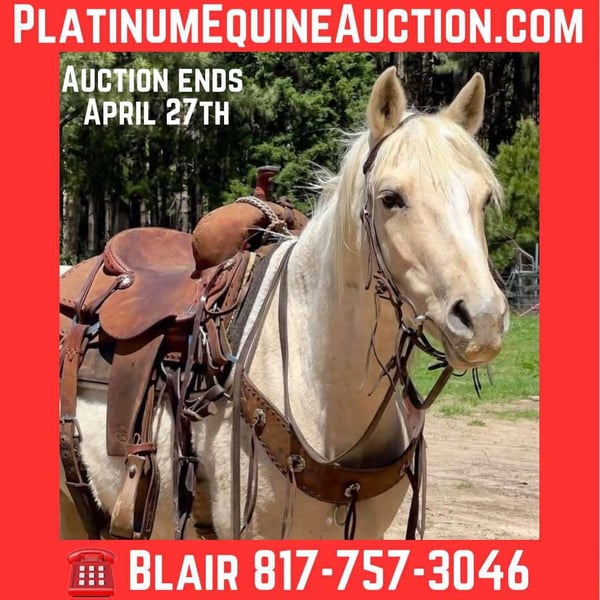 ONLINE AUCTION Place your bids at www.PlatinumEquineAuction.com Starting Bid $3500 Auction ends April 27th, 2025 Need a new saddle? Check out White Rock Saddles on our website or Facebook! We are proud to offer “Boot Scoot N Champ” or Boots as we call him for short. He is the most gorgeous jaw dropping buckskin gelding that you will lay your eyes on. Anywhere this boy goes he is greeted with “wow you’re beautiful” and he loves the attention! Boots is registered with the American Quarter Horse Association. His papers go back to the well known “Skipa” Boots has many money earners on his papers, if you take him to the show ring he’s sure to prove results! He is 5 years old and will mature at 15.1hh. Boots is not only bred to a T, conformationally correct, and stunning he is also fancy broke, fun and handy enough for a cowgirl! He will move right off of your seat and leg. His transitions both upward and downward are effortless. He will lope right from a walk and stop on whoa. Boots has a soft mouth and will ride in any bit from a simple snaffle to a curb. This boy is an all rounder and can head any direction. Boots is quick on his feet and very catty along with being quick to pick up anything you throw at him. He has been started on the barrels as well. He’s got plenty of miles out on the trails. Boots has been to many local metro and state parks. He’s willing to lead or follow in a group or ride out alone. Boots has been roped off of and done some basic ranch work. Give this boy a bath and take him to the show ring or just enjoy a relaxing trail ride or get him in the barrel racing/roping pen. He’s fun for the more experienced rider but has a sensible mind. He has recently started his English training and is doing amazing. He jumps a 10 every time! This boy is the definition of an all around horse. Please enjoy his video as he can speak for himself. Located in Howell Michigan 48855 call or text Ellesse Schwartz at 248-390-6831 with any questions. Shipping is avaliable anywhere in the US. ONLINE AUCTION Place your bids at www.PlatinumEquineAuction.com Starting Bid $3500 Auction ends April 27th, 2025 Need a new saddle? Check out White Rock Saddles on our website or Facebook!