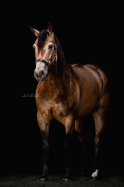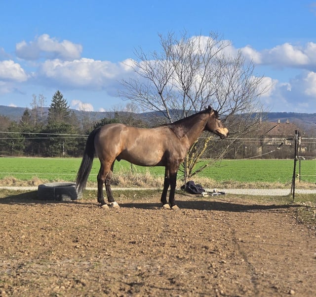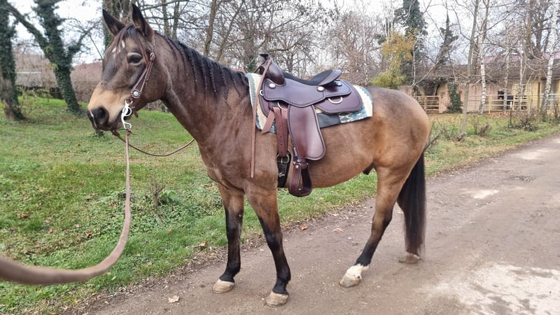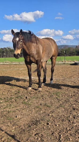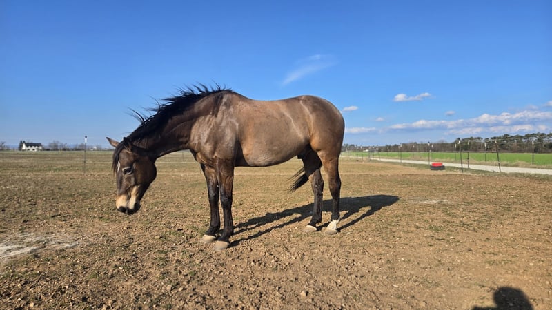 I am looking for a new home for my Quarter Horse gelding. He is comfortable in both a box with paddock and an open stable. He ranks high in the herd hierarchy. He loves spending time with his human and is very affectionate and well-behaved in handling. He is easy to load for the farrier (currently shod in front, barefoot behind – he is also familiar with sliders) and the veterinarian (vaccinations for West Nile, Tetanus, and Influenza). His teeth were last floated in spring 2025, and a chiropractor has been to see him 1-2 times a year. He needs a confident rider for riding, as he can be a bit spooky at times, but otherwise he is quite lazy and well-behaved in the arena and on the round pen. Riding out on trails needs some practice, as I tend to be nervous and transfer that to him, which makes him nervous and skittish. He has been in my possession since September 2020 and has never been ill. In October, we had our first competition in Ranch Trail and Ranch Riding. He is currently ridden about five times a week, 1-2 times by my trainer and the remaining days by me.