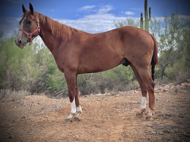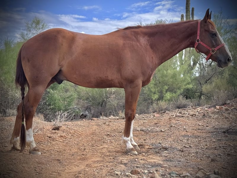 🔥 Happening NOW thru August 20th - Available EXCLUSIVELY on HP Bid’s website! For more details and to register visit: https://hpbids.com CONSIGNOR CONTACT: ESCUDA RANCH - (480) 612-5449 LOCATION: Phoenix, AZ BREED: American Quarter Horse REGISTERED: No REGISTERED NAME: N/A COLOR: Sorrel HEIGHT: 14.3 AGE: 10 GENDER: Gelding 💨 Dash – The Ultimate Gentleman's Ride!🐴 Meet Dash – a grade 10-year-old sorrel gelding standing at 14.3 hands with all the handle and class you could want in a horse. Dash is extremely well-mannered both on the ground and under saddle. He stands tied quietly, loads effortlessly into the trailer, and you can mount and dismount from either side without a fuss. Under saddle, Dash is very broke and has been trained to a high level. He spins both ways like a reiner, has been roped off of extensively, and carries himself with ease. His slow, collected canter is to die for, and he can transition into it from a walk with a smoothness that’s hard to find. That said, Dash does have a lot of buttons — so while he’s gentle, safe, and respectful, he’s not ideal for a total beginner. A handy kid or confident, slightly above-beginner adult will get along with him great. It’s not a matter of bad behavior — Dash does NOT buck, rear, or crow-hop, even after months off. He’s simply responsive and well-trained, and a rider who’s too green might give him unclear cues that could confuse him. He also loves trail riding, is not spooky, and gets along well with other horses on the trail. He’s fantastic for the farrier, easy to catch, and a joy to have in the barn. If you're looking for a horse with tons of training, a willing attitude, and a rock-solid mind, Dash could be your perfect match. Come try him out and see why everyone falls in love with this kind, capable gelding! 🐴✨