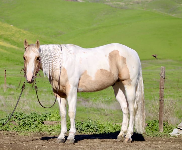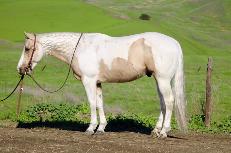 ONLINE AUCTION Place your bids at www.PlatinumEquineAuction.com Starting Bid $3500 Auction ends January 25th, 2026 Need a new saddle? Check out White Rock Saddles on our website or Facebook A Golden Gelding Wish a Golden Heart (and Major Puppy-Dog Energy) 8 Years Old • 15 Hands • Palomino Paint Gelding If horses had a “golden retriever” category, Butters would be the poster child. He’s safe, kind, and steady—and yes, he absolutely believes everyone is his friend. Butters is a beautiful palomino paint, with a rich golden coat and a long, flowing mane and tail that shine like diamonds in the sun. He’s the kind that catches your eye first, then wins your heart without trying. Under saddle, Butters has an easy, forgiving way of going that makes riders relax without realizing it. He’s calm, patient, and naturally adjusts to his rider like it’s his job (because he takes that job very seriously). From kids to adults, beginners to experienced riders, he’s the type that quietly takes care of his people. On the trail, Butters is dependable and unfazed. He rides confidently alone or in a group and is happy leading the pack, following behind, or cruising quietly in the middle. Tarps, flags, bouncy balls, obstacles, water crossings, logs, narrow paths, wildlife, traffic, towns, machinery, and new environments are all no big deal to him—he takes it all in stride with a relaxed, “we’ve got this” attitude. In the arena, he’s professionally broke with smooth, comfortable gaits and soft transitions. He rides collected, keeps a nice headset, and is easy to guide one-handed. He’s not in a hurry, not complicated, and not interested in causing drama—he’s here for a pleasant ride and a good day. Butters has also been used around the ranch and has been started roping, proving he’s more than just cute. He’ll step up and work when asked, then happily go back to babysitting duty without missing a beat. On the ground, he’s exactly what you’d expect: easy to catch, good for the farrier and veterinarian, stands tied quietly, loads well, and enjoys attention. He gets along well with other horses and does well in a stall or pasture. If he could carry his own brush, he probably would. Butters will ride bareback, double, or in a halter and stays the same steady, happy gelding every time. He’s the kind of horse families search for—safe, trustworthy, fun to be around, and genuinely enjoyable to own. 📍 Located in Paicines, California 📞 Longhorn Ranch – Dina 831-537-1915 We can help arrange safe, reliable transportation with reputable haulers to get your new horse home anywhere in the United States. ONLINE AUCTION Place your bids at www.PlatinumEquineAuction.com Starting Bid $3500 Auction ends January 25th, 2026 Need a new saddle? Check out White Rock Saddles on our website or Facebook