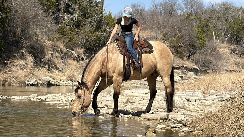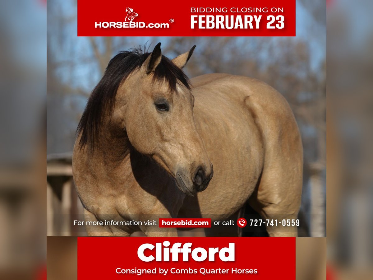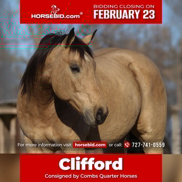 💎 𝐓𝐇𝐄 𝓓𝓲𝓪𝓶𝓸𝓷𝓭 𝐒𝐇𝐎𝐖𝐂𝐀𝐒𝐄 💎 Happening now thru MONDAY | FEBRUARY 23rd - Available EXCLUSIVELY on HorseBid's website! For more details and to register visit: www.Horsebid.com CONSIGNOR CONTACT: Combs Quarter Horses 727-741-0559 LOCATION: Cleburne, TX BREED: AQHA REGISTERED: Yes REGISTERED NAME: DunIt Like Freckles COLOR: Buckskin HEIGHT: 15.3 AGE: 10 GENDER: Gelding Talk about the whole package! Clifford is one that will truly check all the boxes! DunIt Like Freckles (Dun It Like Lena x Chickasa Freckles) Clifford is an amazing 10yr old 15.3h buckskin gelding! Clifford is by Dun It Like Lena who is by the one and only NRHA hall of fame Hollywood Dun It! Out of Chickasa Freckles by the NCHA money earning stallion Commander Freckles! From the AQHA to the local shows to the trail rides.. this guy will keep you in the spotlight! DISPOSITION: Clifford is the definition of a loving, easy going big gelding. He loves bath time, he loves belly scratches and he will smile for cookies! Clifford has a great in your pocket personality thats easy to love! Clifford stands like a statue for grooming, washing, saddling, mounting block and he’s extremely easy to bridle! Clifford is well suited for all ages and sizes. From the lesson barns, the show barns and the trail riding homes.. I think everyone is sure to enjoy this big beautiful boy! WESTERN EXPERIENCE: Clifford was professionally started and trained as a Reiner. He’s got all the fancy bells and whistles without being overly sensitive to riders cues. He’s more like a slow motion Reiner that excels in the ranch riding/pleasure. Clifford has phenomenal transitions with nice, easy, smooth consistent gaits. He’s got a very nice easy jog and a very comfortable lope. Clifford will ride off of leg or seat cues for the more advanced riders or you can just neck rein him around for those learning the ropes. When you’re ready to slow down just say the word whoa and Clifford will come to a safe, easy stop. Clifford really stands out in the ranch classes! If you just want to trail ride you’ll really enjoy every time you climb onboard! Clifford ties quietly to the side of the trailer for convenient tacking up. No spook or silly business. Clifford doesn’t mind the wildlife, cows, traffic, dogs or any other things you see out on the trails. He loves the water, he goes up, over, under and through anything you point him at! He will ride out along or in a group. He will also ride front, back or middle of the pack. You can also lope away leaving him behind or run up behind him.. nothing bothers him! ENGLISH EXPERIENCE: Clifford is just starting his English riding career and he not only loves it.. he’s amazing under English tack! He will absolutely stand out in the HUS classes! He’s amazing! Clifford also goes right to the jumps! He’s brave, easy and honest! Clifford has a bright future in the Hunter ring! UPKEEP: Clifford is currently eating free choice alfalfa and 1 1/2 scoops of basic pellets twice a day. No supplements or maintenance required to keep this guy sound! We do have shoes on Clifford all the way around as a personal preference. Would be happy to pull back shoes before hauling. TURNOUT: Clifford is quiet in a group or single turnout. Not aggressive and doesn’t go looking for a fight. He’s very playful and really likes to put on a show for the camera! Just a happy go lucky guy! GROUND MANNERS: Clifford is a perfect gentleman on the ground. He’s very aware of personal space and little toes! He’s quiet and gentle enough for even the little ones to tote around. Loads and unloads easily. Stands single tied and cross-tied. BAD HABITS/ VICES: Clifford has no bad habits or vices. No bite, kick, rear, buck or bolt. TACK: Clifford will ride bareback, English or western. He will ride in a halter and lead rope, a snaffle, a short shank snaffle or just about anything you want to try. He’s really not picky. BOARDING: Temporary board is available to arrange pick up. Absolutely no rush. Coggins and health certificate will be provided and in hand for hauler. Please feel free to contact me for any further information at 727-741-0559. This is a Florida number that I’ve had for years.v