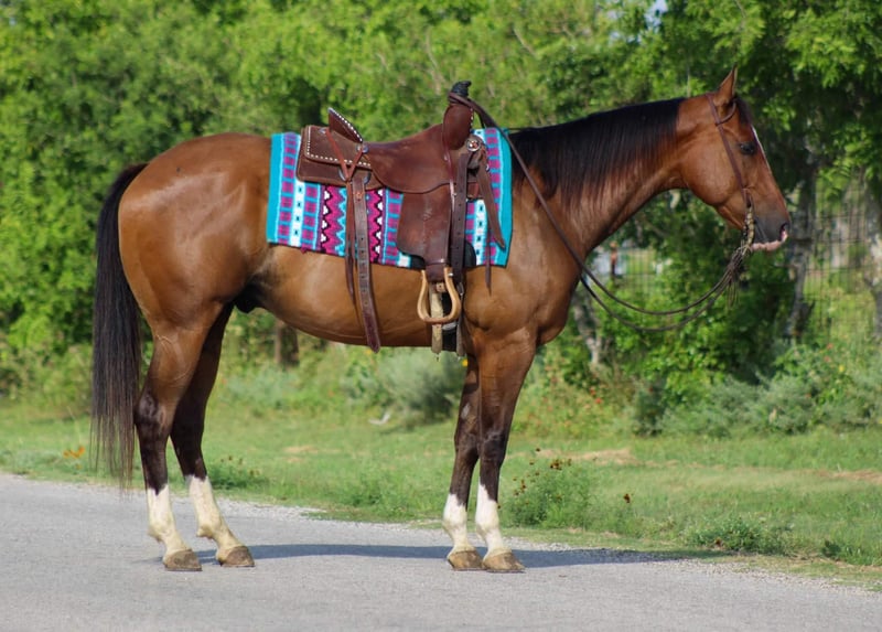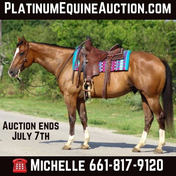 ONLINE AUCTION Place your bids at www.PlatinumEquineAuction.com Starting Bid $3500 Auction ends July 7th, 2024 Need a new saddle? Check out White Rock Saddles on our website or Facebook! Alvin is a 8 year old bay gelding standing 15.2 hds tall . He’s got plenty of chrome to get you noticed whenever you take him . Alvin has had a ton professional training and is a finished western pleasure horse . He’s got a smooth rocky chair lope to him and an even smoother slow jog , he is one you won’t be sore when you get done riding him . Alvin has dabbled in a little bit of everything from the show pen to the trails , we have even used him to bring up roping steers . Someone is going to get an extremely nice horse ! He is SAFE , gentle , YOUNG, talented, gorgeous and extremely well broke ! He has been shown at 4H shows in the western classes including trail , western pleasure and halter classes . He would make a great ranch rider for the ranch riding shows . Whether you’re looking for your next show horse or just wanting a good broke safe trail horse to enjoy this guy fits the bill for it all . Alvin is one we trust with absolutely everyone we have led 3 & 4 year old kids around on him and it was there first time being on a horse that’s how much we trust him ! We have gave several lessons on him from kids to adults and all levels of riders . He is very forgiving and always try’s to please . This guy has a heart the size of Texas ! Alvin also loves to go down the trails. He is confident , brave and will go wherever you point him to . He will cross the smallest creeks to the biggest rivers , goes over logs , tarps and, bridges . He is also traffic safe , he’s used to dogs and kids running around him . I trust this horse with absolutely everyone from the ground to his back , he has impeccable manners and is a total sweetheart! He loves to be groomed and will fall asleep every time . Alvin checks all the boxes when it comes to looking for your next equine partner ! He’s an absolute barn favorite and I know he will be become that at his new home also! If you need help with transport don’t hesitate to ask we have a list of reputable haulers that can get him safely to your doorstep world wide. Located in Stephenville, TX. Contact M$ Performance Horses Michelle 661-817-9120. ONLINE AUCTION Place your bids at www.PlatinumEquineAuction.com Starting Bid $3500 Auction ends July 7th, 2024 Need a new saddle? Check out White Rock Saddles on our website or Facebook!
