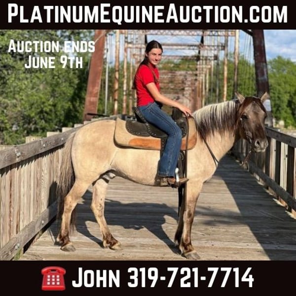 ONLINE AUCTION Place your bids at www.PlatinumEquineAuction.com Starting Bid $3500 Auction ends June 9th, 2024 Need a new saddle? Check out White Rock Saddles on our website or Facebook! Ajax is a 53” Grulla Fjord Crossbred Pony that is broke for anyone in the family to ride from grandkids to grandma. He has been ridden in parades, down multiple trails in multiple state parks. He has been to Eminence Missouri, Palo Duro Canyon, & the Canadian River. He is very reliable, safe and sound. He loves attention and he has gentle disposition. He does not spook from trains, cars, wildlife, tractors or skid loaders. He likes dogs and is easy to catch. Ajax has also been started in the harness. Ajax is a slow going, but very sturdy Pony he can carry a big person or a child. Ajax has been used for lessons in our summer camp. He stands tied to the Hitchin rail or all night sleepovers on camping trips. He loads and unloads with ease. He crosses anything including water, ditches, logs with no problem. He stands like a statue for the Farrier, or to be clipped and groomed. He is very trustworthy. He would never kick or bite. Ajax is up-to-date on all shots ,worming and dentistry. Ajax needs no maintenance or special care. He is a truly unique one of a kind Pony for any level of rider, he is truly a gentle soul, I have owned Ajax for a long time and have many pictures and videos of the whole family with him. Ajax gets along well in the herd with mares, gelding or other ponies. If you’re looking for a pony to ride once a month or every day he is more than willing, he never gets in a hurry and he never gets fresh. He is very reliable. Call John McPhail 319-721-7714 with any questions. Located in Lisbon, IA. ONLINE AUCTION Place your bids at www.PlatinumEquineAuction.com Starting Bid $3500 Auction ends June 9th, 2024 Need a new saddle? Check out White Rock Saddles on our website or Facebook!