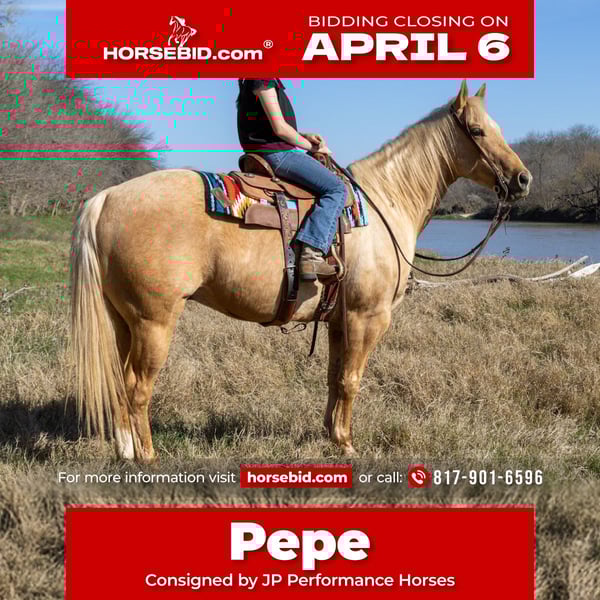 🌟𝑨𝒑𝒓𝒊𝒍 𝐀𝐋𝐋 𝐒𝐓𝐀𝐑 𝐋𝐈𝐍𝐄𝐔𝐏🌟 Happening now thru MONDAY | APRIL 6th - Available EXCLUSIVELY on HorseBid's website! For more details and to register visit: www.Horsebid.com CONSIGNOR CONTACT: JP Performance Horses 817-901-6596 LOCATION: Weatherford, TX BREED: Quarter Horse REGISTERED: Yes REGISTERED NAME: Pepe’s Cat COLOR: Palomino HEIGHT: 14.3 AGE: 11 GENDER: Gelding If you’ve been searching for that true, all-around family ranch horse that checks every box… here he is. And yes — he’s that eye-catching golden palomino that turns heads everywhere he goes. He has a very sweet personality, not spooky and enjoyable to have in the barn. Pepes Cat was started in a cutting horse program in his younger years, and it shows in everything he does. He’s broke, broke, BROKE with a big stop, super soft in the bridle, and a smooth one-hand neck rein. This is the kind that responds off feel and makes you look good every time you swing a leg over. But what really makes him special? 👉 He’s SAFE. We’re talking little kids to grandma safe. The kind you can trust to pack anyone around and take care of them. Ride him bareback in a halter, bridleless, or tack him up and go to work — he’s the same honest, gentle gelding every single time. He”s been used as a turn back horse in the cutting pen to a ranch horse in the mountains of Colorado. Pepe is one the whole family can use and he would excel in ✔️ Ranch Riding / Ranch Pleasure prospect ✔️ Team penning, turn back in cutting pen & sorting ✔️ Ranch rodeos/ daily Ranch duties ✔️ Playdays for the kids ✔️ Trails, cruising, and everyday riding The list truly is endless. He’s the kind you can enjoy today and take in any direction tomorrow. On top of all that: ✔️ Meets you at the gate ✔️ Easy to catch anywhere ✔️ Loads & unloads like a gentleman ✔️ Great for the farrier ✔️ Gets along great in the herd ✔️ Recently had teeth floated This is the horse everyone calls about but can never find — a true family-safe, versatile gelding with a solid foundation and a heart of gold. Please contact JP Performance Horses at 817-901-6596 to schedule a time to try Pepe in person or have a FaceTime call if you live far away. Shipping can be arranged anywhere.