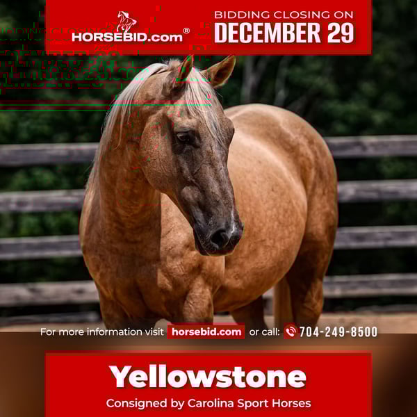 ⚜️ 𝓗𝓮𝓻𝓲𝓽𝓪𝓰𝓮 𝐖𝐢𝐧𝐭𝐞𝐫 𝓒𝓵𝓪𝓼𝓼𝓲𝓬⚜️ Happening now thru MONDAY | DECEMBER 29th - Available EXCLUSIVELY on HorseBid's website! For more details and to register visit: www.Horsebid.com CONSIGNOR CONTACT: Carolina Sport Horses 704-249-8500 LOCATION: Clover, SC BREED: Quarter Horse REGISTERED: No COLOR: Palomino HEIGHT: 15.2 AGE: 10 GENDER: Gelding Carolina Sport Horses proudly offers Yellowstone for your consideration. Yellowstone is a seasoned, well-rounded horse whose foundation as a true ranch horse sets him apart. He brings together real-world experience, a quiet and dependable mind, and the athleticism needed to succeed beyond his western roots. At Carolina Sport Horses, we are known for offering horses that are honestly represented and carefully selected for quality, safety, and versatility. While online purchasing is not for everyone, we strive to make the process transparent and comfortable. Buyers are always welcome to visit our farm, meet Yellowstone in person, and experience firsthand the temperament and training that make him such a standout. A veterinary evaluation is available upon request. Yellowstone’s extensive ranch background has given him an exceptional mind and unmatched reliability. He is calm, confident, and sensible—accustomed to long days of work, varied terrain, and new situations. This real-life experience translates into a horse that is naturally brave, steady, and trustworthy under saddle. Despite his ranch foundation, Yellowstone transitions seamlessly into English riding. He moves willingly into a soft, balanced frame, works comfortably in the arena, and shows the athleticism and adjustability desired for flatwork, low fences, hunter paces, and all-around riding. He is the type of horse that makes riders feel secure while still offering the talent to continue developing in a new direction. Safe, honest, and versatile, Yellowstone is well suited for riders seeking a horse with substance, experience, and adaptability. Whether your goals include trail riding, ring work, or expanding into English disciplines, Yellowstone offers a rare combination of dependability, athletic ability, and genuine quality. Contact us at 704-249-8500