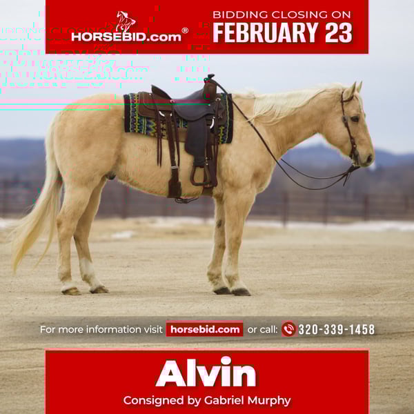 💎 𝐓𝐇𝐄 𝓓𝓲𝓪𝓶𝓸𝓷𝓭 𝐒𝐇𝐎𝐖𝐂𝐀𝐒𝐄 💎 Happening now thru MONDAY | FEBRUARY 23rd - Available EXCLUSIVELY on HorseBid's website! For more details and to register visit: www.Horsebid.com CONSIGNOR CONTACT: Gabriel Murphy 320-339-1458 LOCATION: Cannon Falls, MN BREED: Quarter horse REGISTERED: No COLOR: Palomino HEIGHT: 15.2 AGE: 11 GENDER: Gelding Alvin is a 11 year old, 15.2 hand STOUT, beautiful palomino grade gelding with striking amber eyes, a thick mane and tail, and all the bone and body anyone could ask for! Built the way everyone wants one and colored to match, he turns heads everywhere he goes! But Alvin is more than just good looks, he is the definition of a “good boy” and a true all around citizen. Under saddle, he is a complete gentleman! He confidently goes through water, over logs, through thick woods, across bridges, and even through traffic with ease. He walks, trots, and picks up both leads correctly, has an easy one hand neck rein, and solid turn around, staying steady and honest every step of the way! Alvin is the kind of horse you can trust, making him the perfect trail partner for even the most inexperienced riders! Alvin is no stranger to a day’s work either, he’s loaded trucks at the sale barns, and penned calves proving he has both the mind and the work ethic to get the job done! On the ground, he’s just as exceptional! Alvin will meet you at the gate, stands tied anywhere to be brushed, saddled, or bathed, and picks up all four feet without a fuss. He loads like a pro and stands quietly to be mounted! Nothing seems to bother Alvin, he takes everything in stride with a calm, steady demeanor! Alvin gets along with everyone he meets, from other people to other horses, he wants to be everyone’s best friend! It’s not often you find a gelding this experienced and beautiful with a personality to match! Alvin truly is one of a kind and anyone would love to have this special, solid, dependable, and most importantly safe gelding in their barn!