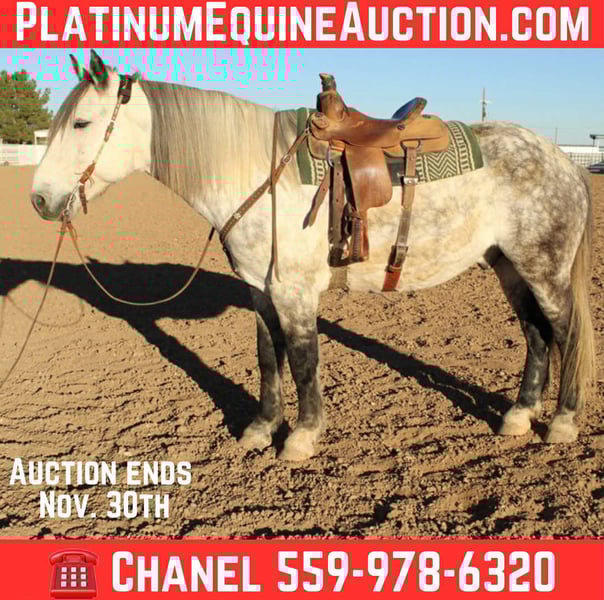 ONLINE AUCTION Place your bids at www.PlatinumEquineAuction.com Starting Bid $3500 Auction ends November 30th, 2025 Need a new saddle? Check out White Rock Saddles on our website or Facebook A real life unicorn! Willie is the total package big, tall, stout and will turn heads wherever you go. The horse that dreams are made of perfect for the whole family. Willie is a 11 year old 16.2 hand 1500lb beautiful grey draft cross gelding. Willie is the first one to greet you in the barn or in pasture and has a larger than life personality. Willie is ready to go in any direction ride him english or western or hop on bareback and go or teach him to pull a cart. He has ridden inside and out well mannered tied at the trailer. Rides trails with easy will cross bridges or skip the bridge and go straight through the water. Has spent time in and out of the arena around cows, construction, Rocky trails, mountain country, dry desert, who needs a car Willie will get you through town just fine. Truly a gentle giant extremely gentle and respectful with children, loves attention, calm, quiet, stands tied, not spooky, no funny business. Good strong feet kept on a consistent schedule . Willie is well broke rides well off neck reining and leg pressure smooth gates good stop and back. The sky is the limit for this horse he is ready to tackle any job you throw at him. Don’t miss your opportunity to own a unicorn. Please contact for any further questions. Located in Roswell, NM. For more info contact Ben Thomas 575-910-0168. ONLINE AUCTION Place your bids at www.PlatinumEquineAuction.com Starting Bid $3500 Auction ends November 30th, 2025 Need a new saddle? Check out White Rock Saddles on our website or Facebook