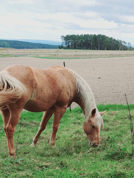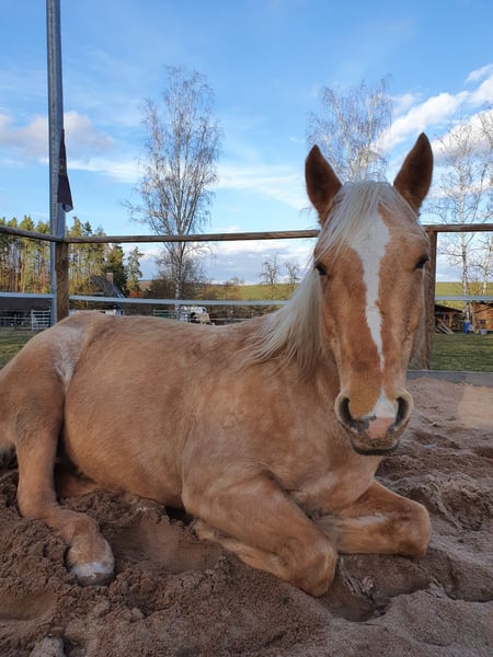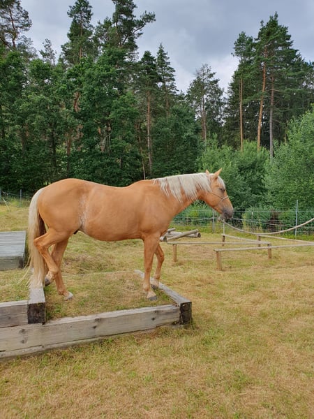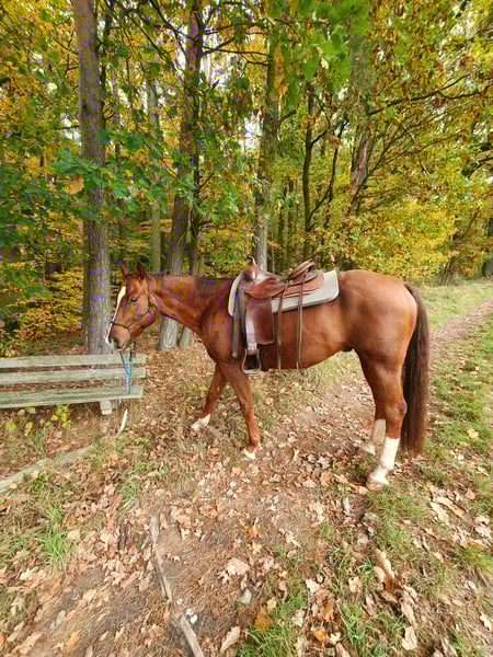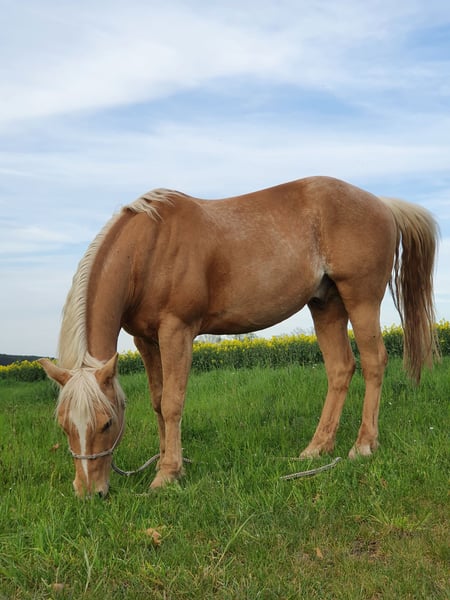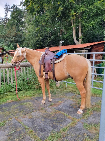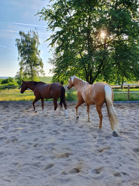 We are giving up horse keeping due to age and are looking for a new home for our two Quarter geldings Tequila (Palomino) and Shorty (Dark Bay). They are both 12 years old and have been together since they were six months old. Therefore, it would be nice if they could stay together. Both horses were trained at the age of 4 by Thomas Günther (Proride Horsemanship). Tequila is an athletic gelding, a son of DQAH Elite stallion Mr. King Raffles. He is ridden for leisure and at mounted archery events/competitions, and he finished the year 2025 as the fourth best horse in Germany. He is familiar with cattle work and is super suitable for ranch horse disciplines. He loves working in the riding arena, jumps over obstacles with an ease that is unmatched, and enjoys going out on trails (even for several days) either alone or in a group. Tequila is a dream for both experienced and inexperienced riders. Shorty is a Quarter horse of the old stock type with large hooves and a sturdy build. He is regularly exercised for leisure (currently unfortunately not, as the riding partnerships have been canceled), mostly ridden in the terrain or led on walks. He is also used as a companion horse. He goes out alone or in a group. Five years ago, a hoof roll was diagnosed on his right front, which does not affect him in any way; therefore, he is offered as a rideable horse. Both horses can be ridden with a halter or a snaffle bit, whether in the riding arena or on trails. Both horses are regularly vaccinated, dewormed, and are easy to load. The price for both horses is €16,500. If you have any questions, feel free to write or call. Horse passports can be sent by email upon request.