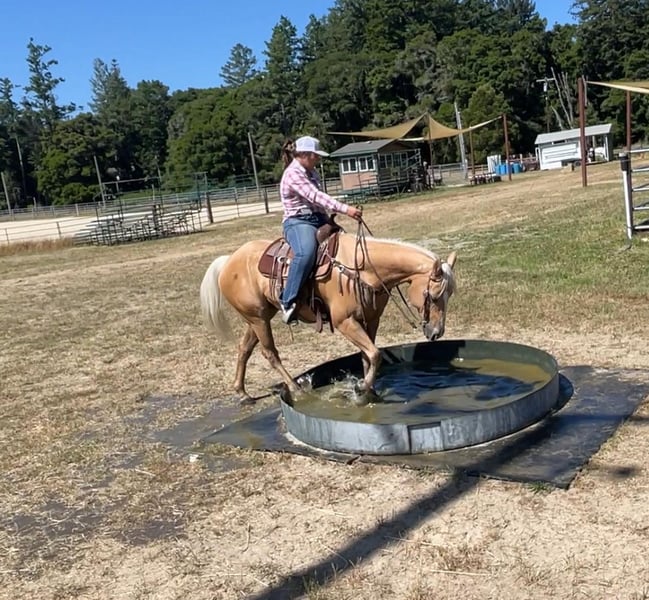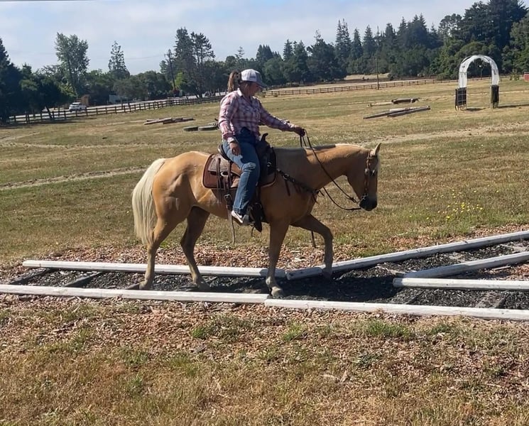 ONLINE AUCTION Place your bids at www.PlatinumEquineAuction.com Starting Bid $3500 Auction ends June 23rd, 2024 Need a new saddle? Check out White Rock Saddles on our website or Facebook! Barbie Doll is a 10yr old grade palomino mare, standing 14.3HH. And yes, she is the Barbie dream horse of every little girls dreams! Barbie had a gentle, kind demeanor and everyone loves her! She is calm, and very easy going to be around. With impeccable ground manners she makes it manageable for any level rider to tack up for a great days ride. Under saddle, Barbie is laid back, slow and easily navigated by one soft touch of a rein. Barbie is responsive to leg cues and rein cues. Barbie has no need for a bridle, you can get her to do whatever you want with just a string around her neck! She is smooth and has nice transitions in between her gaits. She is one of our all time horse to take out on a trail ride with how uncomplicated she is. She makes any ride worry free and fun! She has been used on all trail obstacles and will do anything asked of her! She has been to mountain trails, down busy highways, and hauled around to local shows. Barbie is not afraid of anything and has zero spook. She has carried flags and walked over tarps without a blink of an eye. She is not “marish” at all and gets along with everyone. She has zero issues.. stands tied quietly, very easy to shoe, loads and hauls great, and requires no maintenance. Located in Bitterwater, CA. For more info contact Cheyenne Rey 831-537-8746. ONLINE AUCTION Place your bids at www.PlatinumEquineAuction.com Starting Bid $3500 Auction ends June 23rd, 2024 Need a new saddle? Check out White Rock Saddles on our website or Facebook!