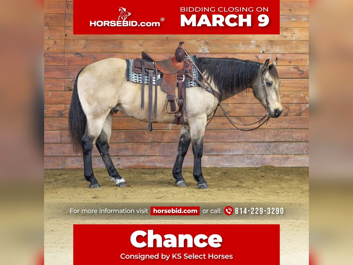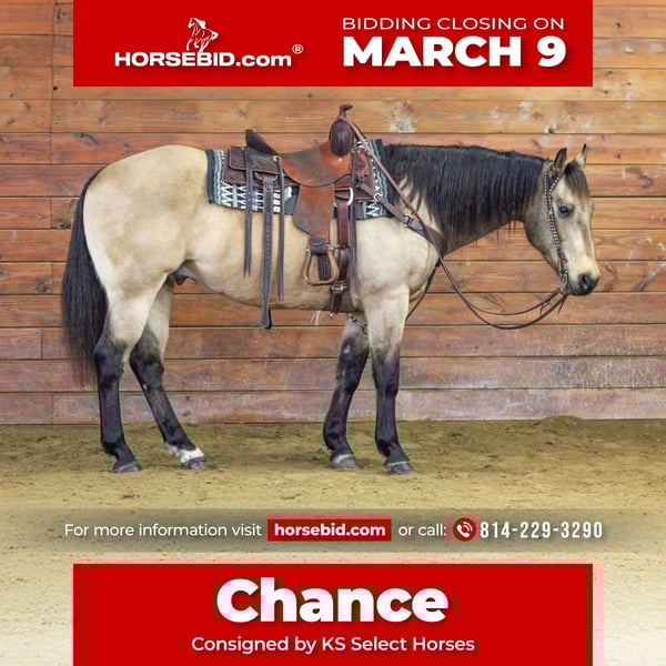ℳ𝒶𝓇𝒸𝒽 ♦️𝐑𝐈𝐃𝐄𝐑'𝐒 𝐂𝐇𝐎𝐈𝐂𝐄♦️ Happening now thru MONDAY | MARCH 9th - Available EXCLUSIVELY on HorseBid's website! For more details and to register visit: www.Horsebid.com CONSIGNOR CONTACT: KS Select Horses 814-229-3290 LOCATION: Clarion, PA BREED: QH REGISTERED: No COLOR: Buckskin HEIGHT: 15 AGE: 12 GENDER: Gelding Chance is a Buckskin Quarter Horse Gelding. If you have been looking for that all around good broke, reliable, dependable and safe gelding then here he is! Chance is a very good looking and attractive looking horse. He is always getting compliments! Not only is he good looking but he also rides very good. One hand neck rein, side pass, trot and canter with a head set and lopes nice circles in the arena. Could go western or English in the arena. Chance is the definition of all around family horse. He is a very good trail horse that goes anywhere you ask him to on the trail and is very seasoned! Doesn't care if he is in the front middle or back of the pack, he takes it all with ease. Crosses water, mud and logs with ease also. Very easy to ride not complicated at all. His great neck rein makes him very easy to steer. Has done ranch work and is good when it comes to working with cattle. Ride him once a month or every day and he will ride the same every day. His nick name is steady eddy because he's so reliable. Don't miss out on this super cool buckskin gelding. Call or Text Kris at 814-229-3290. We can help arrange delivery anywhere in the United States. Thank You and God Bless